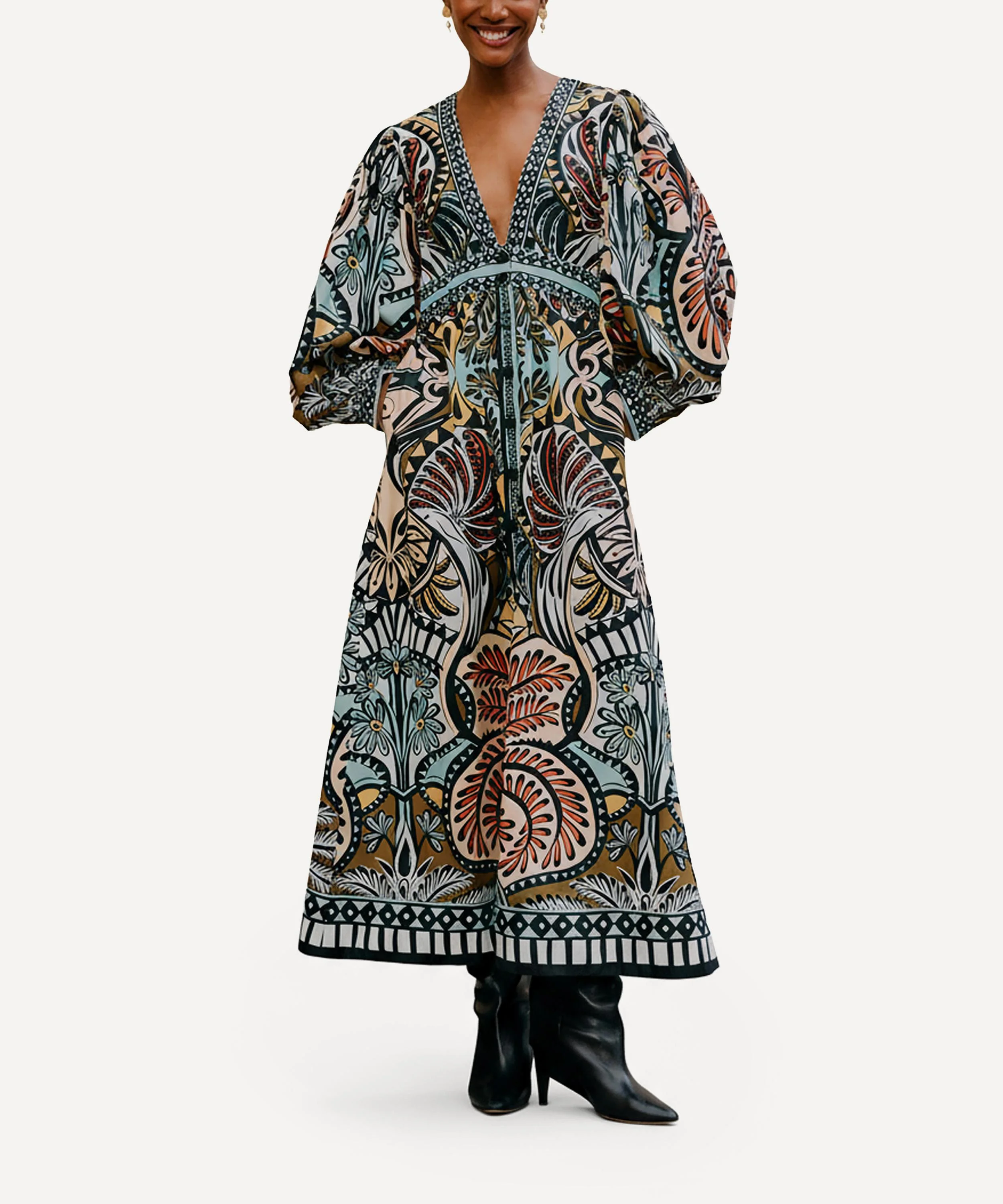 DETAILS Cotton maxi-dress Slim fit Long blouson sleeves V-neckline Empire waist Lower button placket Flared skirt Concealed size zip closure Multicolor Balamana print COMPOSITION & CARE 100% Cotton Machine wash, gentle cycle