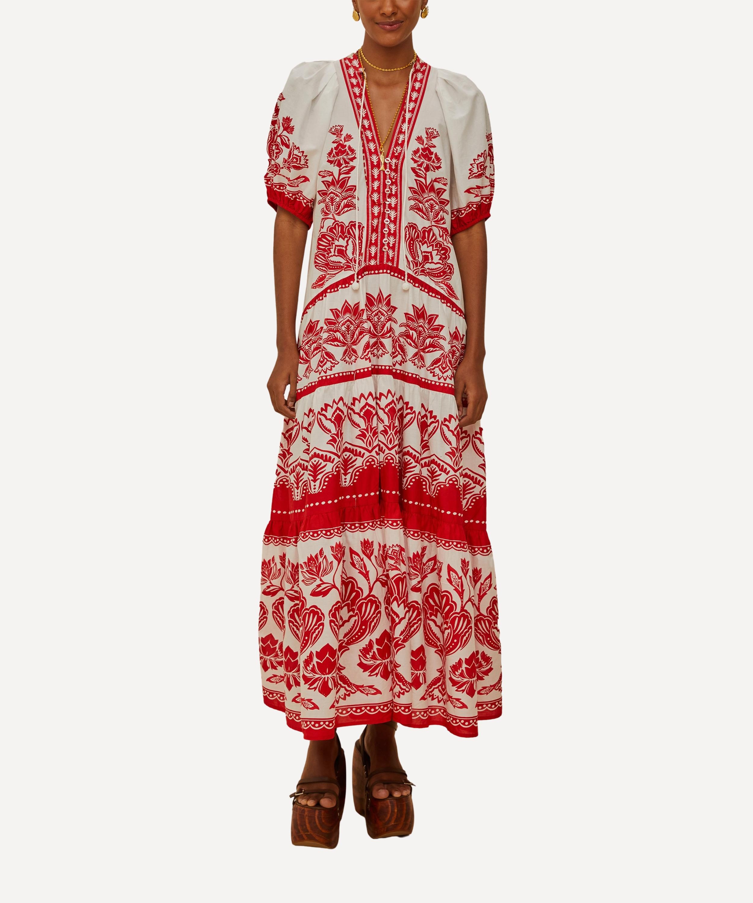 DETAILS Cotton dress Midi length Loose fit Short puff sleeves V-neckline with ties Partial button placket Tiered skirt COMPOSITION & CARE 100% Cotton Machine wash delicate cycle