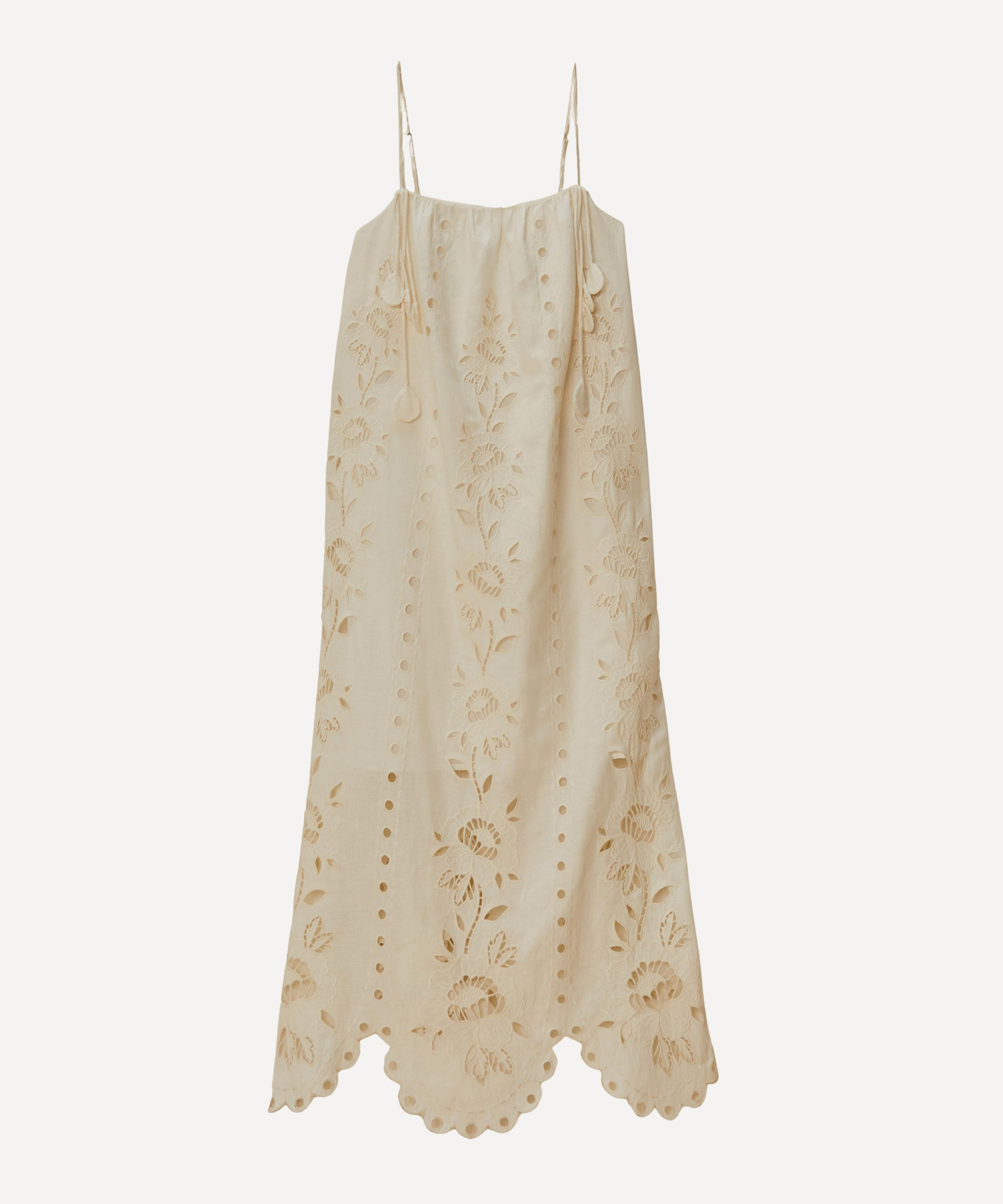 DETAILS Linen-blend maxi dress Loose fit Sleeveless Spaghetti straps Square neckline Eyelet details Tonal floral embroidery COMPOSITION & CARE 55% Linen; 45% Viscose Hand wash