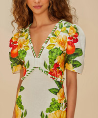 DETAILS Linen maxi dress Fitted bodice Short puff-sleeves V-neckline Rope trim Invisible side zipper Picnic Flowers print COMPOSITION & CARE 100% Linen Hand wash
