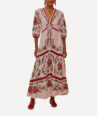 DETAILS Maxi dress Relaxed fit Flared silhouette Mid-length sleeves V-neckline Circular cut-out with ties Tiered skirt Invisible zipper Pink Flower Tapestry print COMPOSITION & CARE 55% Linen; 45% Viscose Hand wash