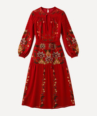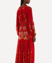 DETAILS Viscose max dress Long pleated sleeves V-neckline with knotted keyhole Braided waist ties Tiered skirt Red Berry Garden print COMPOSITION & CARE 100% Viscose Machine wash, gentle cycle