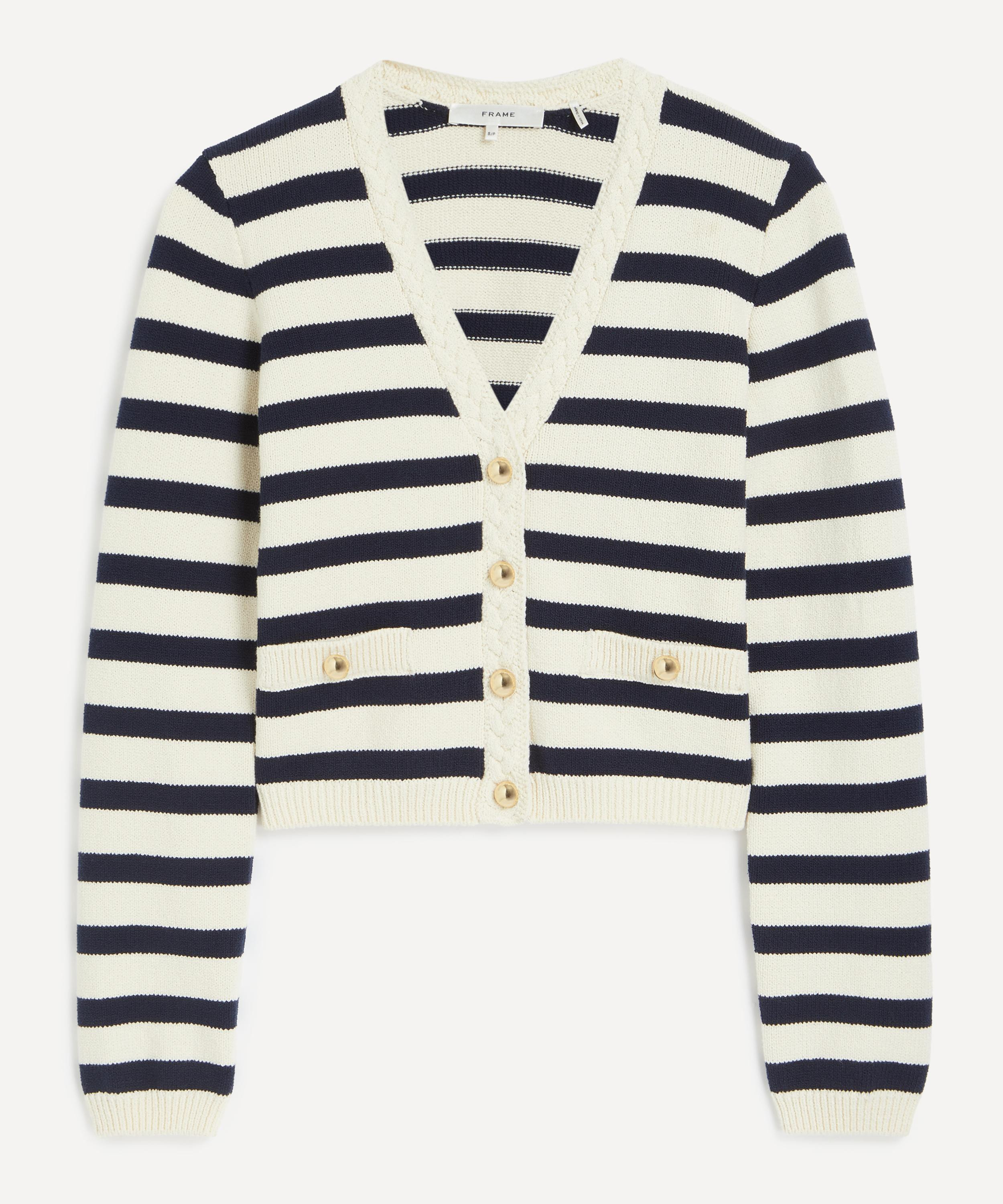 DETAILS Striped cotton-knit cardigan Regular fit Slightly cropped length Long sleeves V-neckline Front button fastening Gold buttons Braided trims SIZE & FIT Model is 175cm/5’9”; Chest:81cm; Waist: 61cm; Hip: 89cm and wears a size S COMPOSITION & CARE 75% Cotton; 25% Polyamide Dry clean