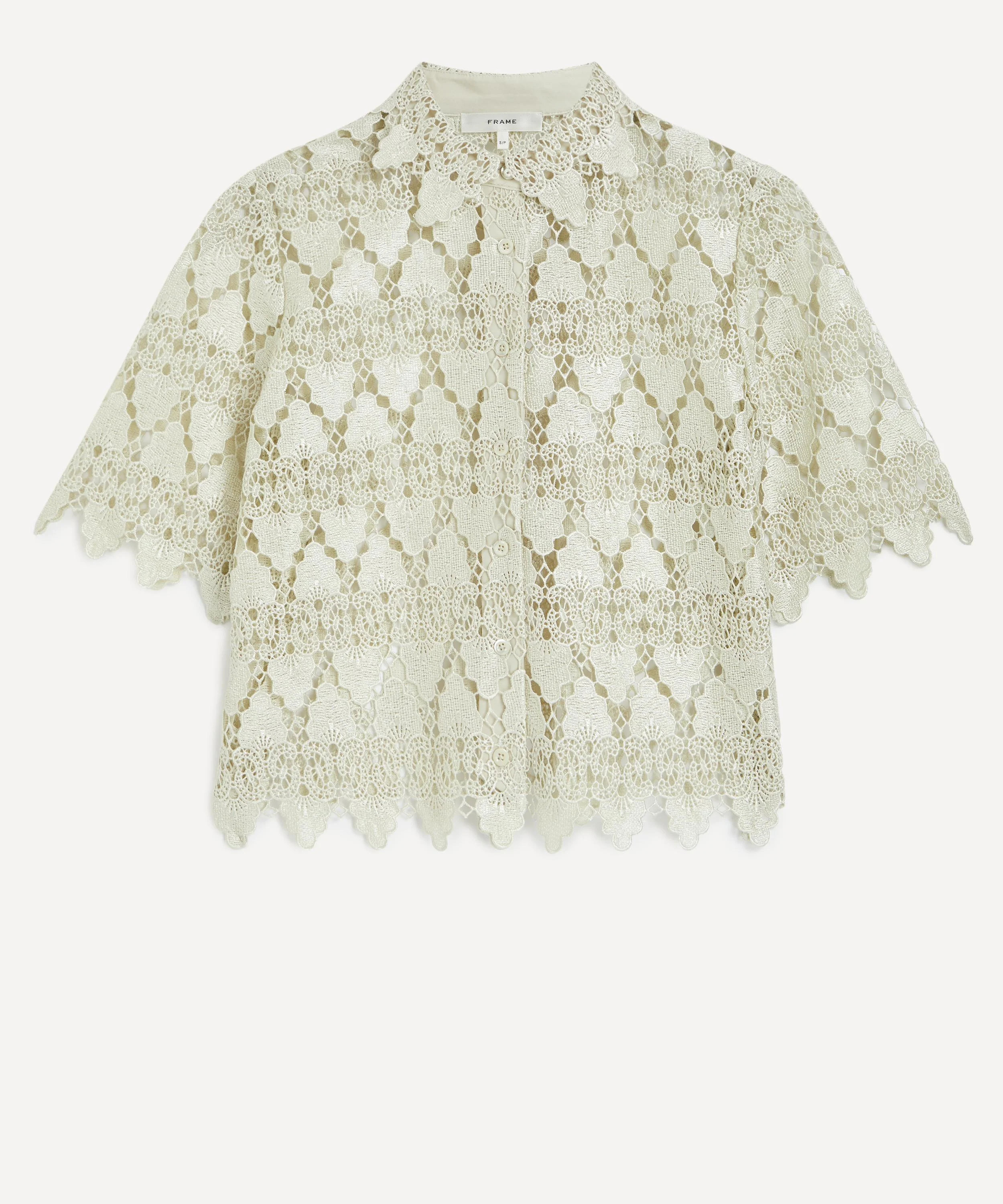 DETAILS Lace shirt Boxy fit Cropped length Short sleeves Lace collar Front button fastening Scalloped hems Unlined SIZE & FIT Model is 175cm/5’9”; Chest:81cm; Waist: 61cm; Hip: 89cm and wears a size S COMPOSITION & CARE 100% Polyester Dry clean