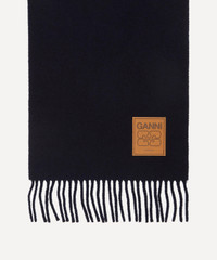 DETAILS Rectangle scarf Crafted from wool Black colourway Fringed ends Ganni logo patch Dry clean only COMPOSITION & SIZE 100% Virgin Wool W: 30.5cm, L: 203cm