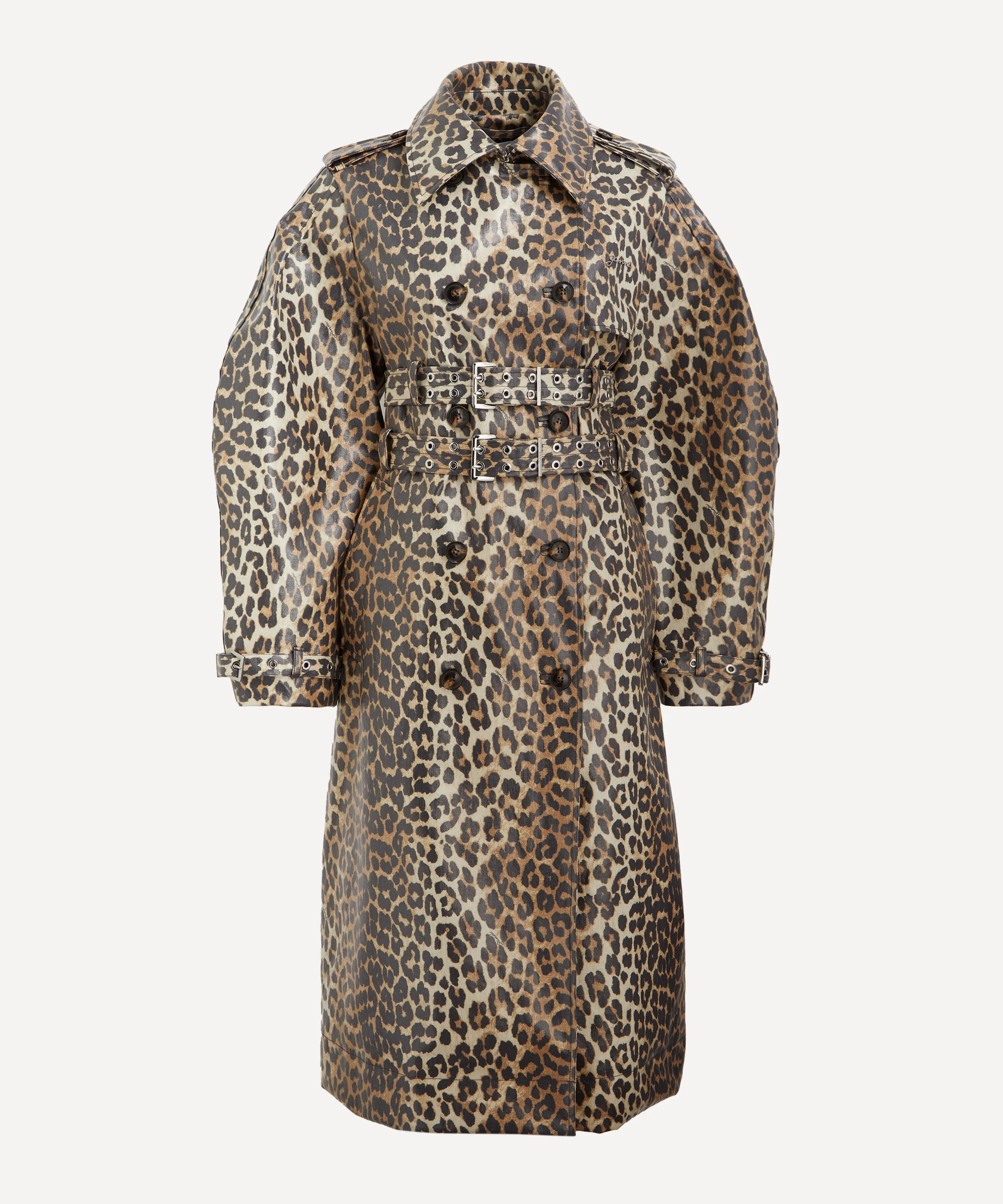 DETAILS Laminated trench coat Leopard print Relaxed fit Double-breasted Shoulder epaulettes Long curved sleeves Buckled cuff straps Convertible collar Gun flap Button fastening Adjustable eyelet belts Two pockets GANNI logo Rear storm flap SIZE & FIT Model is 178cm/5'10"; Chest: 78cm; Waist: 60cm; Hip: 90cm and wears a size 8 COMPOSITION & CARE 45% Hemp; 37% Cotton, 18% Polyurethane Dry clean