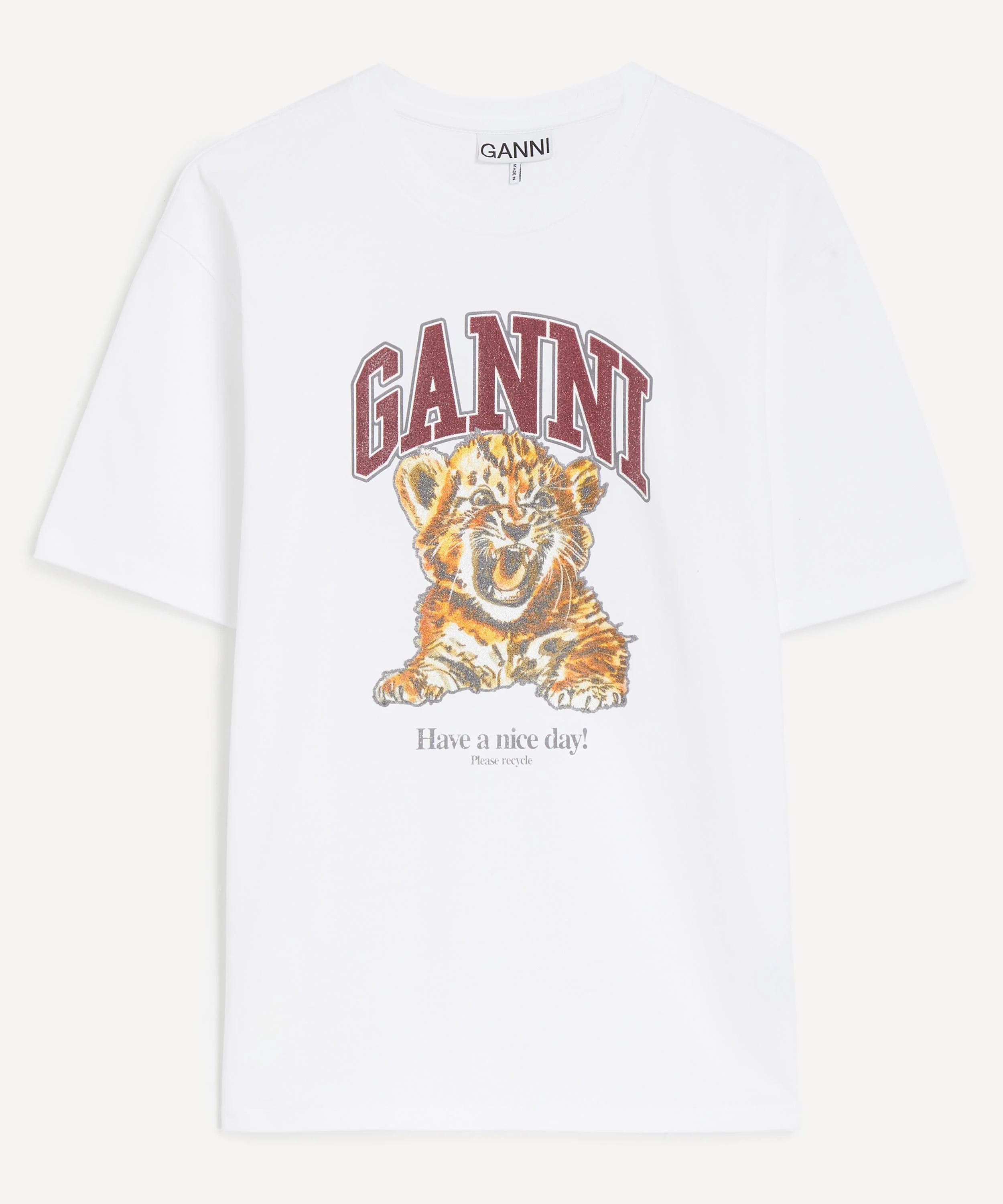 DETAILS Cotton t-shirt Regular fit Short sleeves Crew neckline GANNI branding Beaded tiger print graphic ‘Have a nice day! Please recycle’ message SIZE & FIT Model is 178cm/5'10"; Chest: 78cm; Waist: 58cm; Hip: 87cm and wears a size S COMPOSITION & CARE 100% Cotton Machine wash, cold