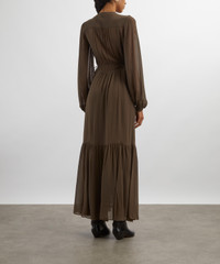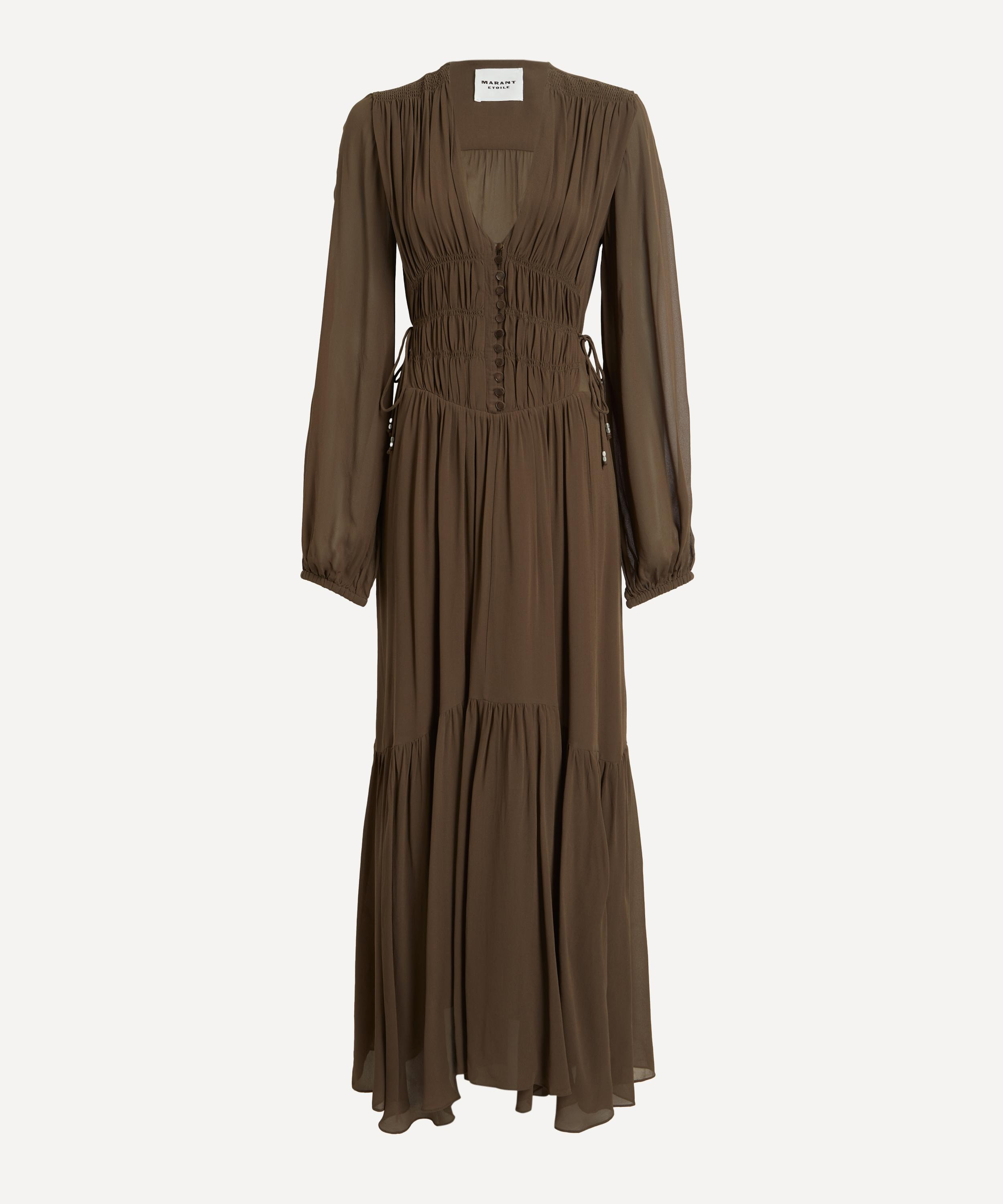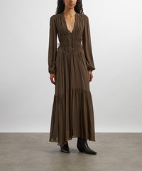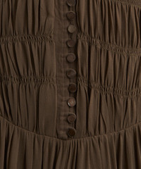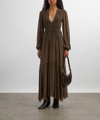 DETAILS Georgette dress Maxi length Relaxed fit Long gathered sleeves Buttoned cuffs V-neckline Buttoned front Fitted drawstring waist Pleated and smocked details Tiered skirt SIZE & FIT Model is 178cm/5'10"; Chest: 79cm; Waist: 62cm; Hip: 88cm and wears a size 8 COMPOSITION & CARE 100% Viscose Dry clean