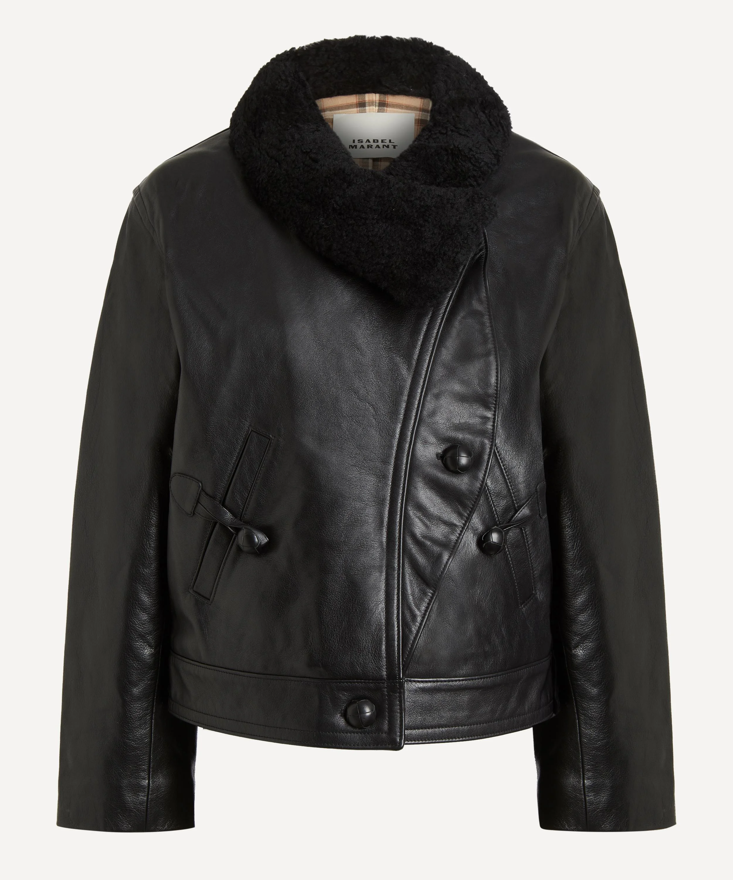DETAILS Leather aviator jacket Straight cut Shearling stand-up collar with tightening tab Long sleeves Asymmetric closure with leather snap buttons Toggle-fastened side pockets Interior pocket Checkered lining SIZE & FIT Model is 178cm/5'10"; Chest: 77cm; Waist: 65cm; Hip: 92cm and wears a size 8 COMPOSITION & CARE 100% Bovine leather Specialist leather dry clean