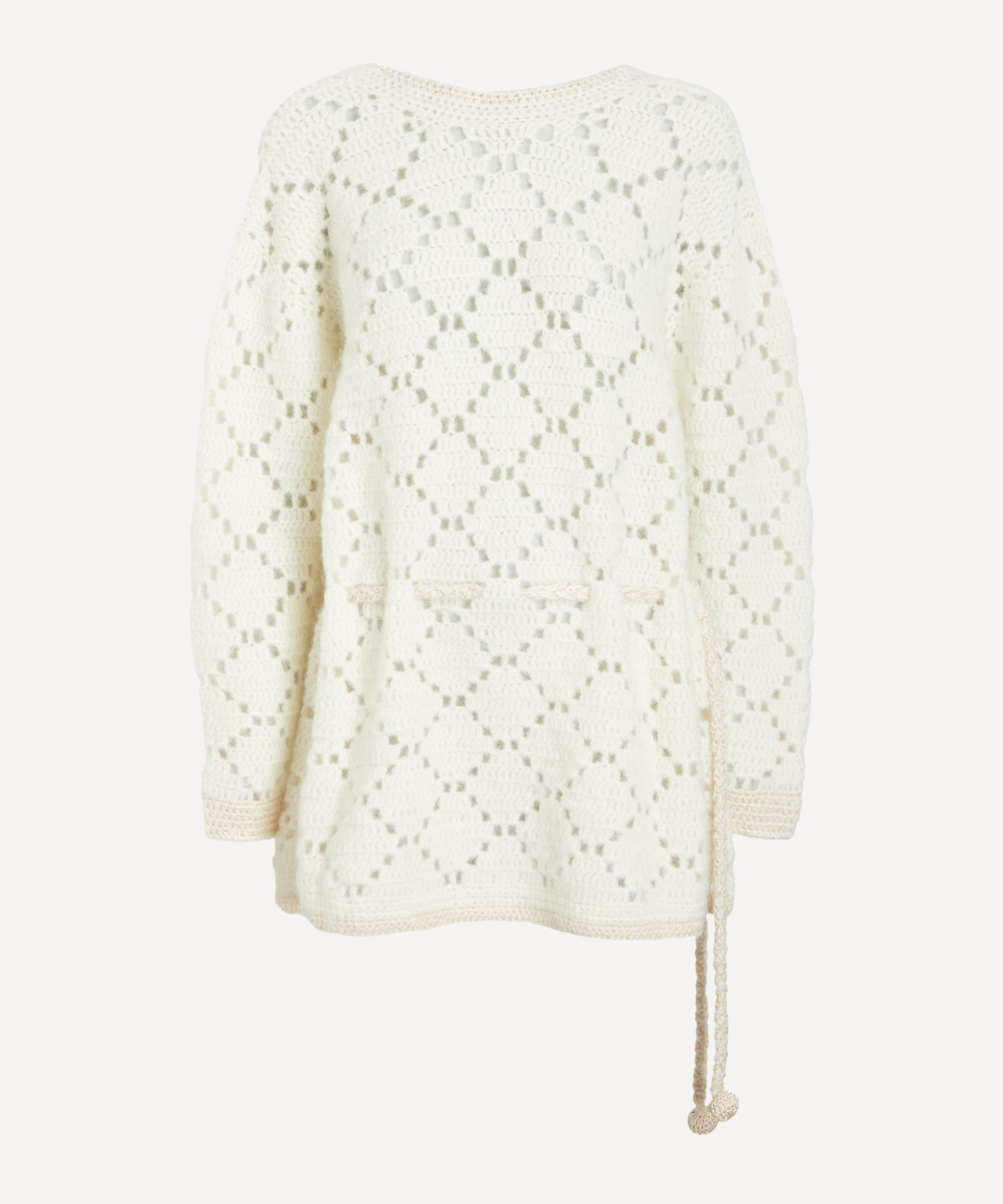 DETAILS Wool-mohair knitted mini dress Hand-crocheted openwork Loose fit Long sleeves Boat neckline Round, low-cut back Drawstring waist ties with pom-pom SIZE & FIT Model is 175cm/5'9"; Chest: 76cm; Waist: 58cm; Hip: 90cm and wears a size 8 COMPOSITION & CARE 38% Polyamide; 32% Wool; 30% Mohair Dry clean
