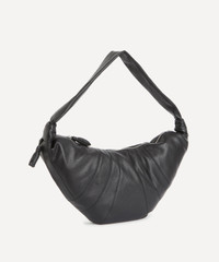 DETAILS Croissant bag Grained leather Handle with knot detail Zip top closure Half-moon silhouette Zipped side pocket Removable zipped pouch on the inside Cotton canvas lining Made in Spain COMPOSITION & SIZE 100% Lamb Leather Lining: 100% Cotton H: 28cm, W: 60cm, D: 17cm Strap L: 86cm