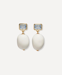 DETAILS Drop earrings 24ct gold-plated brass Pale blue coloured glass top Ivory porcelain bead drop Sterling silver port and butterfly fastening COMPOSITION & SIZE 24ct Gold-Plated Brass; Sterling Silver; Pale Blue Glass; Ivory Porcelain Drop: 3.8cm