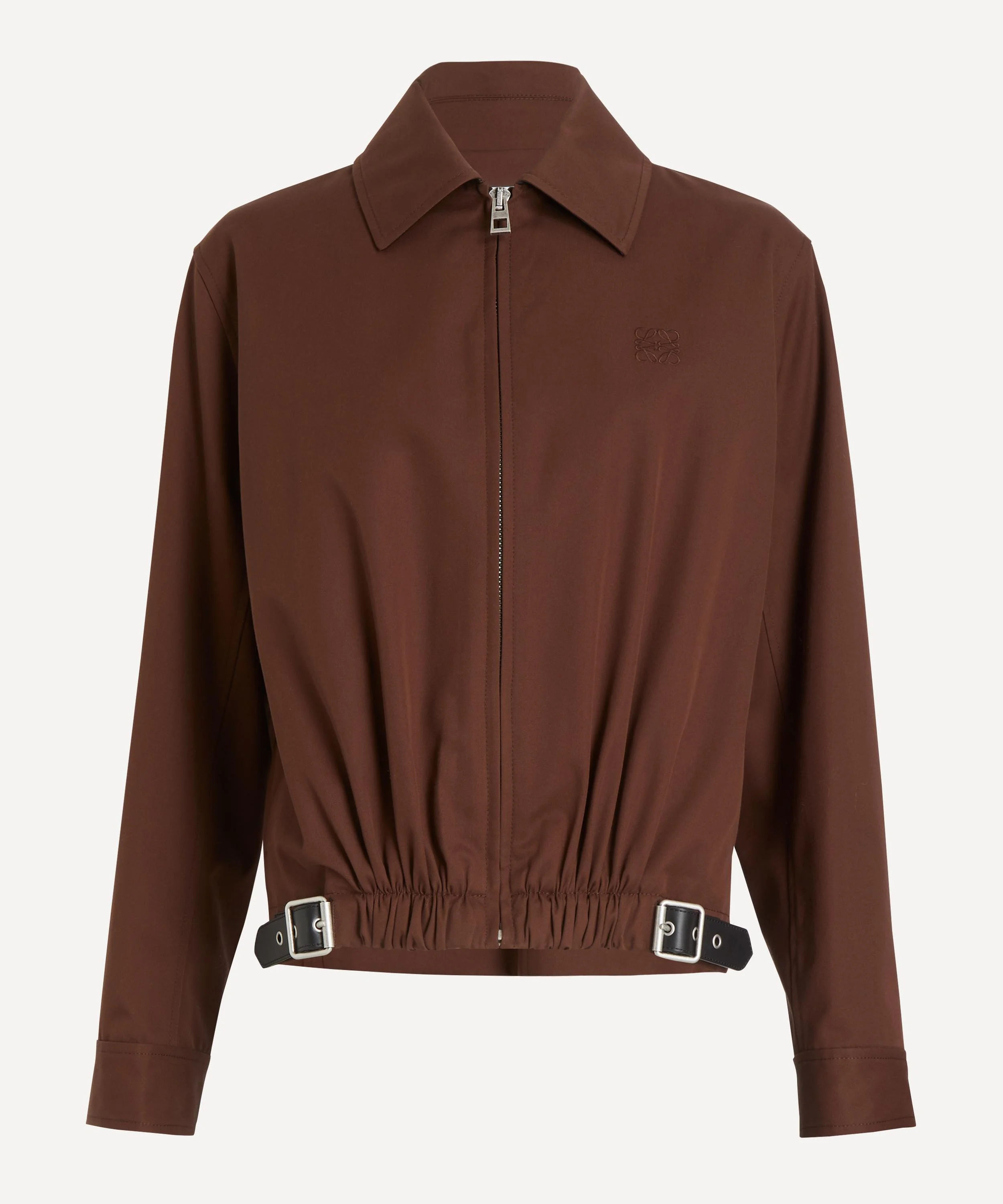 DETAILS Cotton-silk twill jacket Regular fit Classic collar Front zip fastening Buttoned cuffs Seam pockets Interior jet pocket Leather buckle adjusters LOEWE-embossed leather patch placed on back SIZE & FIT Model is 178cm/5'10"; Chest: 77cm; Waist: 65cm; Hip: 92cm and wears a size 8 COMPOSITION & CARE 90% Cotton;10% Silk Dry clean