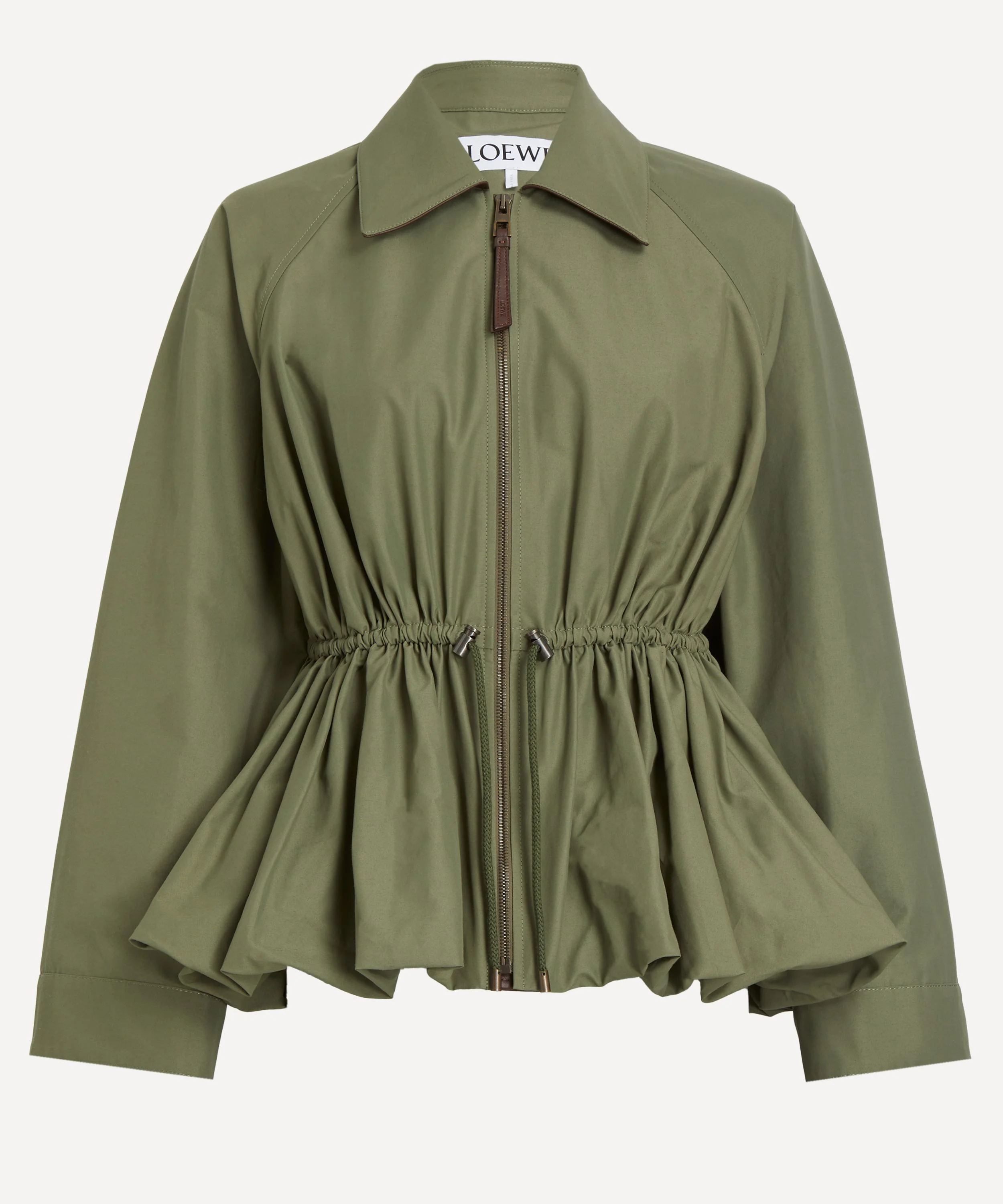 DETAILS Cinched jacket Zip-up placket Point collar Adjustable drawstring waist Long sleeves Fully lined Anagram embossed leather patch placed at the back SIZE & FIT Model is 180cm/5'11"; Chest: 81cm; Waist: 61cm; Hip: 88cm and wears a size 36 COMPOSITION & CARE 60% Cotton; 40% Polyamide Machine wash