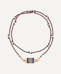 DETAILS Locket necklace 18ct gold Double loop Mauli cord Blue enamel Heart-cut diamonds Round diamond accents Freshwater pearls Finley chiselled finish Inscription: ”Amour Toujours” Handcuff finish at each end COMPOSITION & SIZE 18ct Gold; 1.02ct Diamonds; Enamel; Freshwater Pearls; Mauli Silk Chain L: 73cm