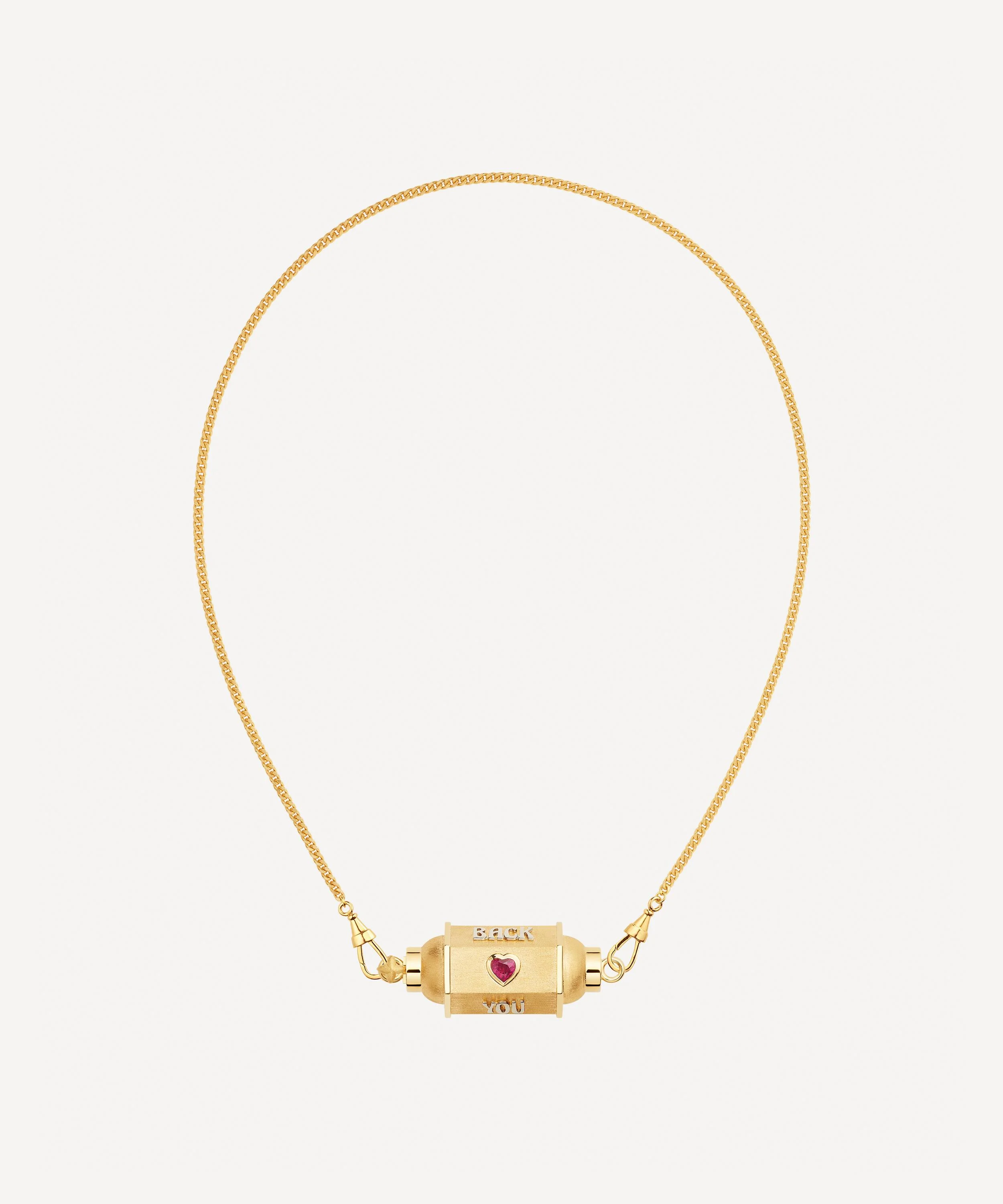 DETAILS Locket necklace 18ct gold Barrel locket pendant Gourmette chain Heart-cut ruby and rose-cut white diamond Inscription: “You to the Moon and Back” Handcuff clasp fastening at each end Coco matte finish COMPOSITION & SIZE 18ct Gold; 0.28ct Ruby; 0.24ct Diamond Chain L: 42cm