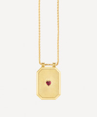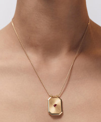 DETAILS Pendant necklace 18ct gold Scapular pendant Heart-cut ruby Spiga chain Lobster clasp fastening COMPOSITION & SIZE 18ct Gold; 0.24ct Ruby Chain L: 44cm