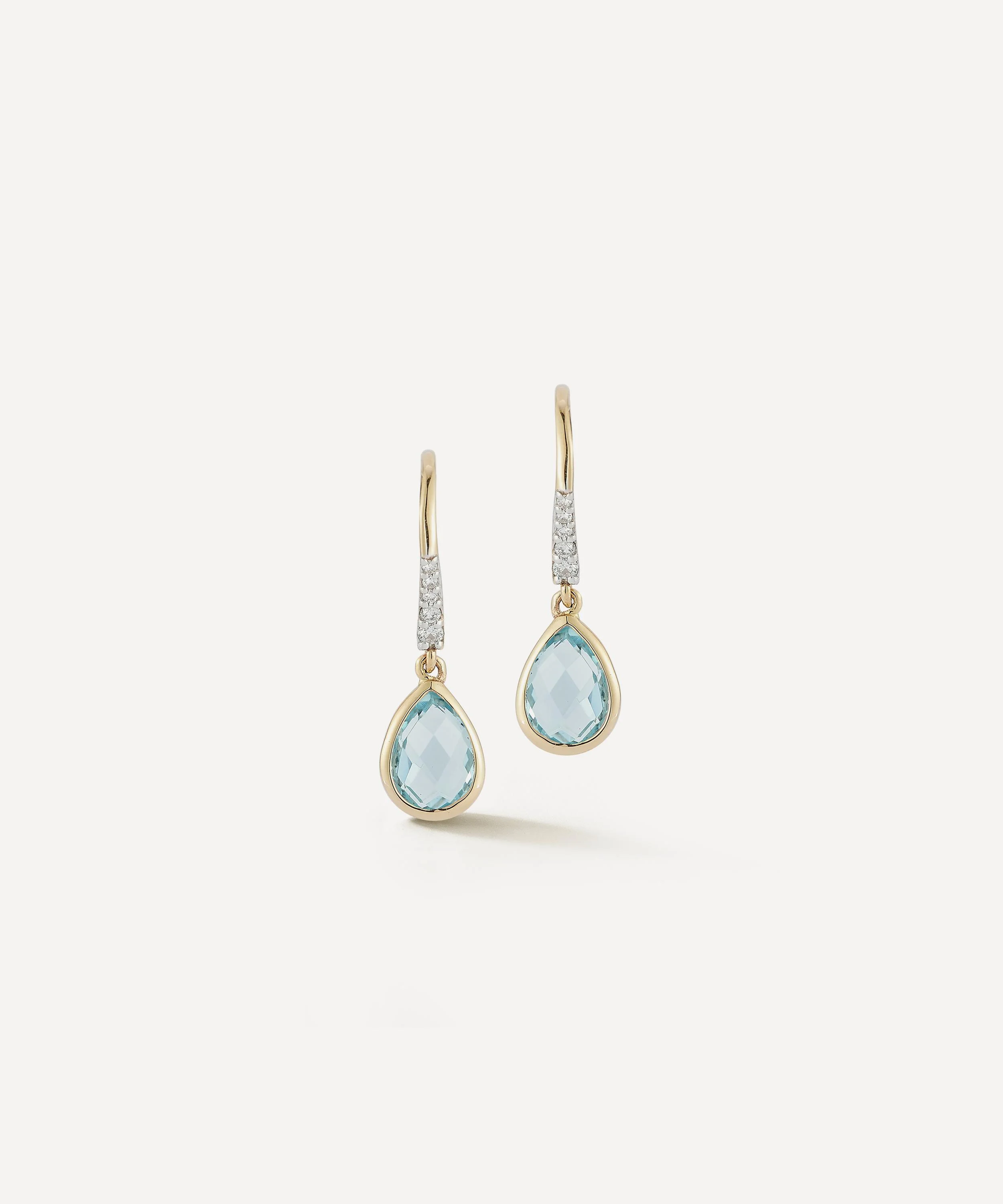 DETAILS Drop earrings 14ct gold Pear-shaped blue topaz Pave diamonds Wire hook fastening Made in New York COMPOSITION & SIZE 14ct Gold; Diamond; Blue Topaz