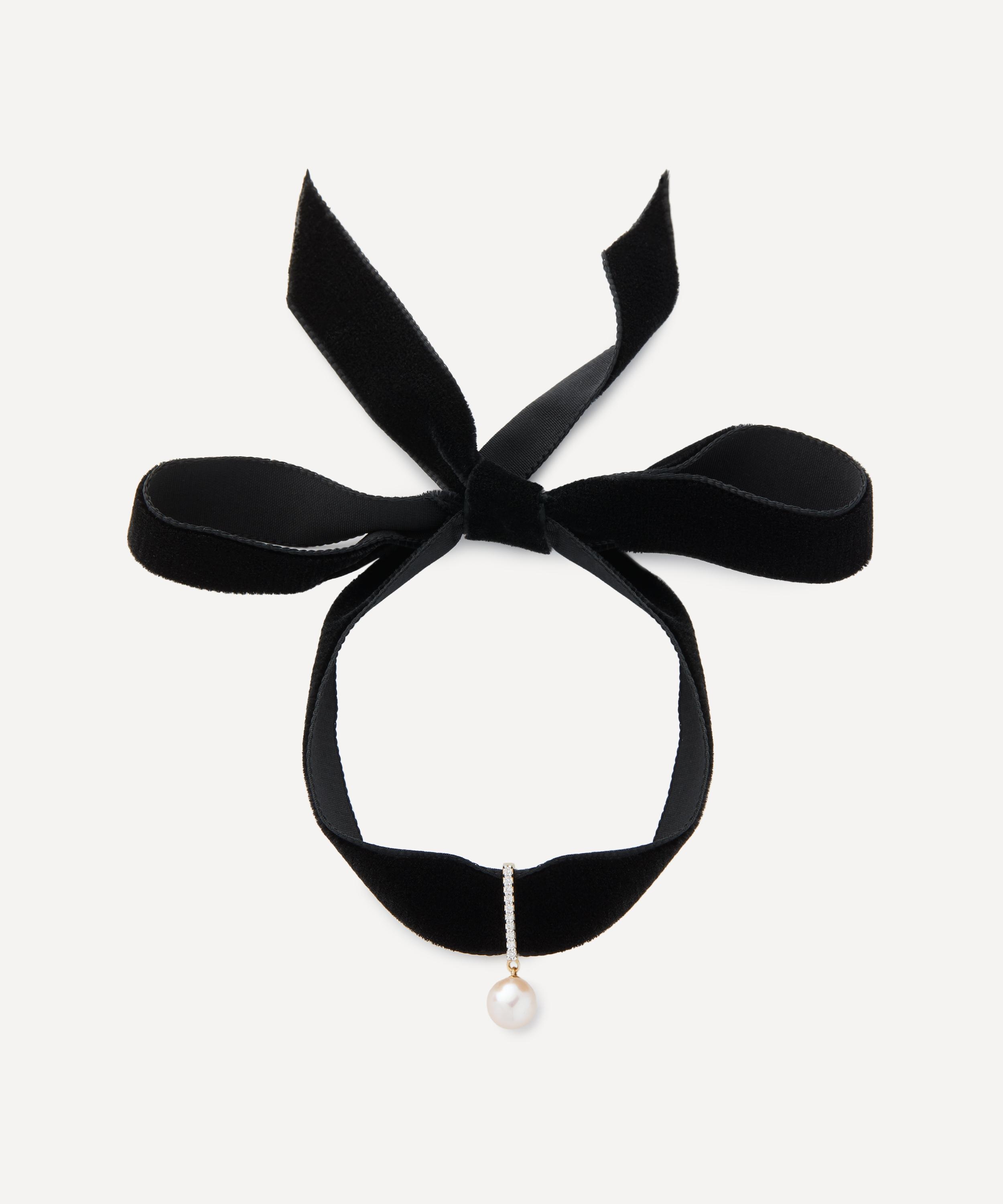 DETAILS Choker necklace 14ct gold French velvet Freshwater pearl Dropped charm Diamond detailing Self-tie closure Made in New York COMPOSITION & SIZE 14ct Gold; French Velvet; Freshwater Pearl; Diamond Pearl Dia: 0.8cm