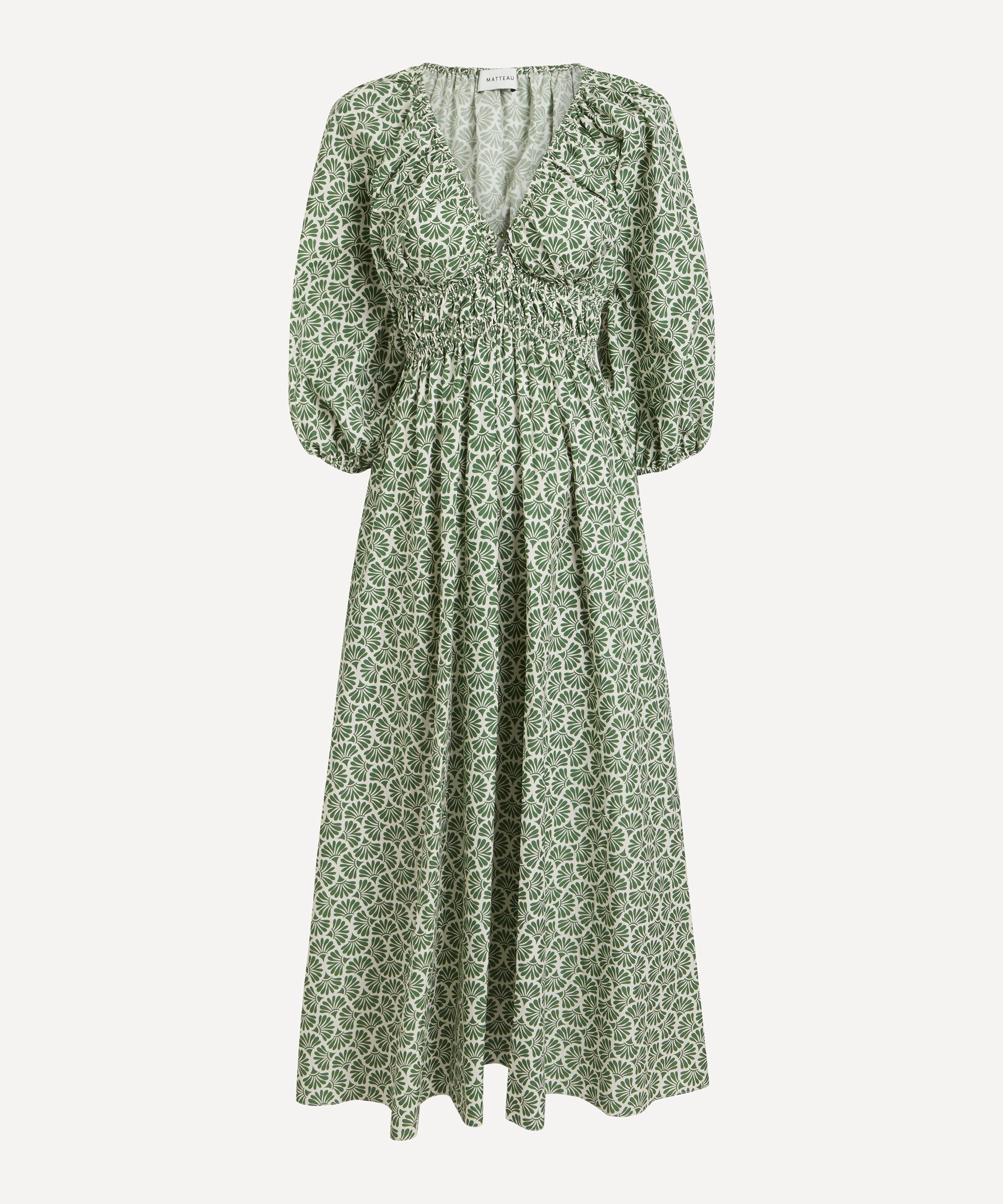 DETAILS Cotton midi dress A-line silhouette Three-quarter-length sleeves V-neckline Elasticated empire waist Inseam pockets SIZE & FIT Model is 179cm/5'10.5"; Chest: 81cm; Waist: 64cm; Hip: 89cm and wears a size 2 COMPOSITION & CARE 100% Cotton Dry clean
