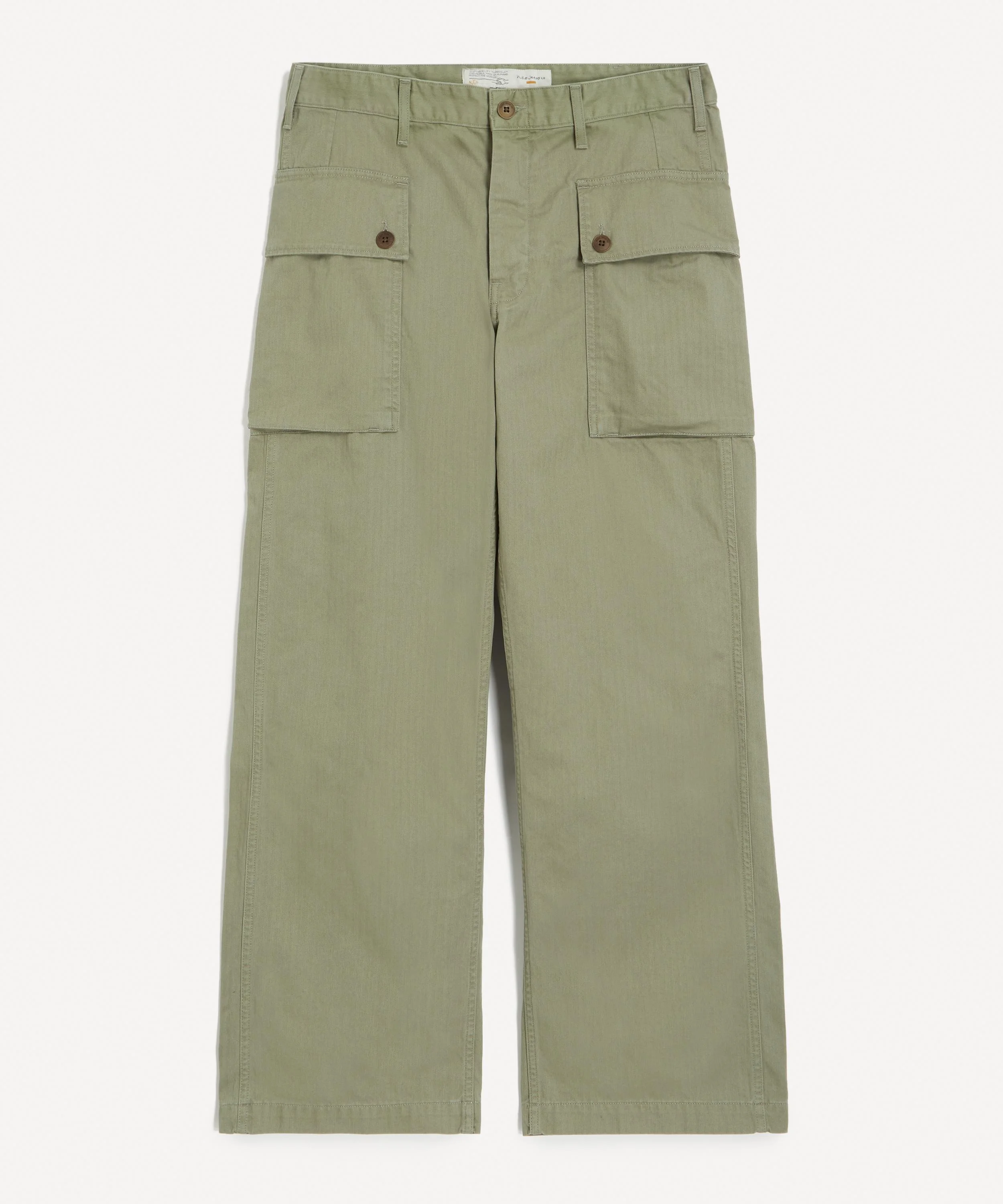 DETAILS Cargo trousers Rigid herringbone twill High waist Loose fit Wide leg Wide leg opening Full length Matching thread at seams Belt loops Button fly Corozo buttons Two cargo pockets Woven label SIZE & FIT Model is 186cm/ 6'1": Chest: 92cm; Waist: 80cm and wears a size 32/32 COMPOSITION & CARE 100% Cotton Machine wash cold