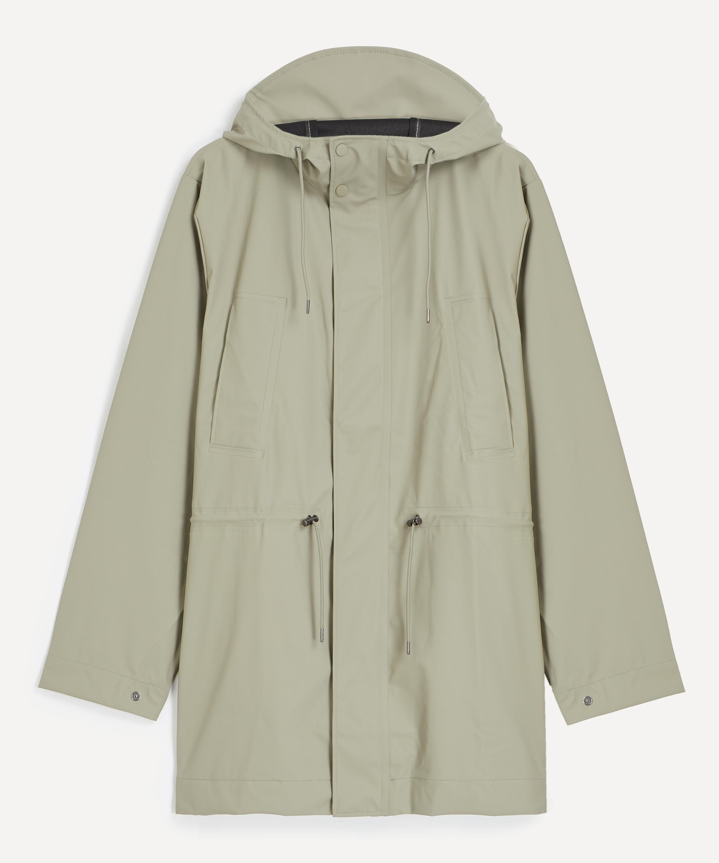 DETAILS Long raincoat Waterproof signature PU fabric Long fit Hood with tie cord Zip closure under wide storm flap with snaps String adjustment at waist Wide welt slip in pockets Exaggerated back yoke with mesh lining underneath Welded seams SIZE & FIT Model is 189cm/6'2.5; Chest: 92cm; Waist: 77cm and wears a size M COMPOSITION & CARE 100% Polyester Machine wash in cold water at 30°C