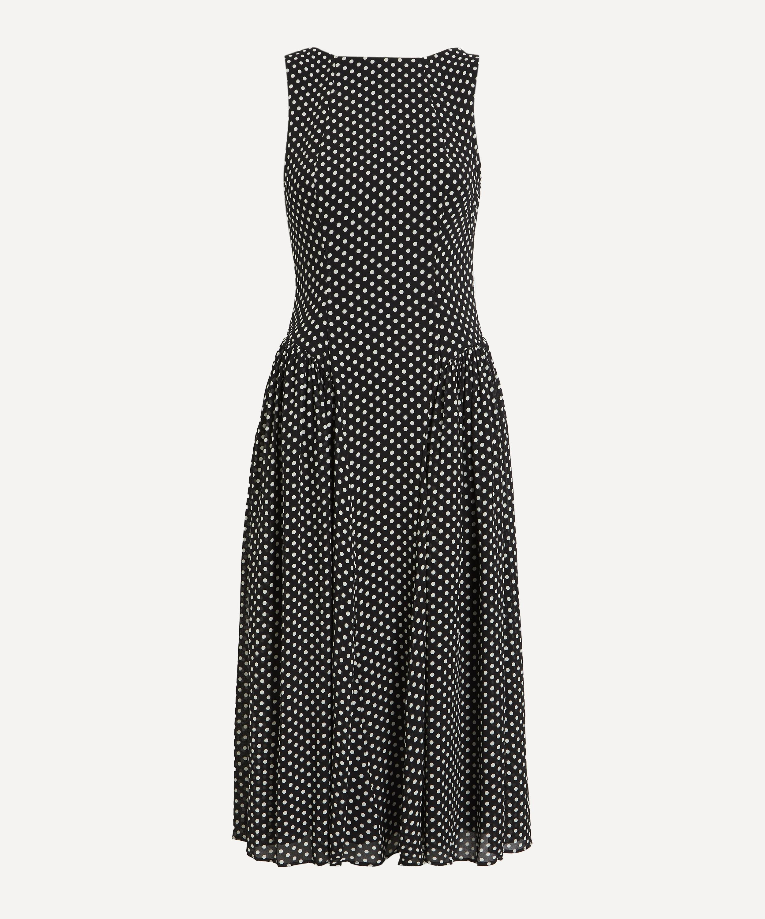 DETAILS Georgette midi dress Black polka-dot print Boat neckline Sleeveless Fitted bodice A-line skirt SIZE & FIT Model is 175cm/5'9"; Chest: 81cm; Waist: 63.5cm; Hip: 92.5cm and wears a size 8 COMPOSITION & CARE 100% Viscose Dry clean