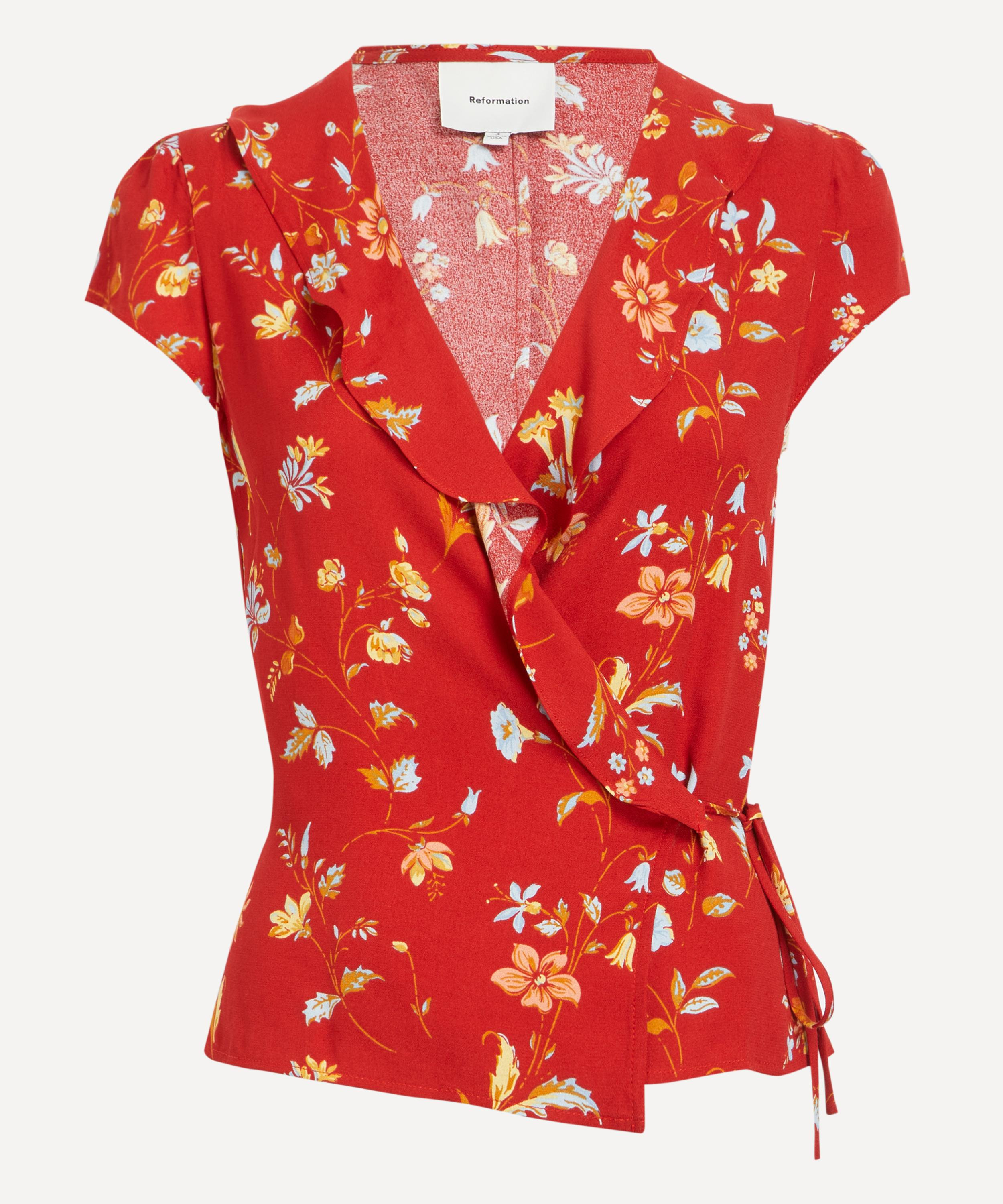 DETAILS Crepe top Regular fit Wrap-over design Short cap sleeves Ruffled V-neckline Side ties SIZE & FIT Model is 175cm/5'9"; Chest: 76cm; Waist: 58cm; Hip: 90cm and wears a size 8 COMPOSITION & CARE 53% Viscose; 47% LENZING™ ECOVERO™ Viscose Dry clean