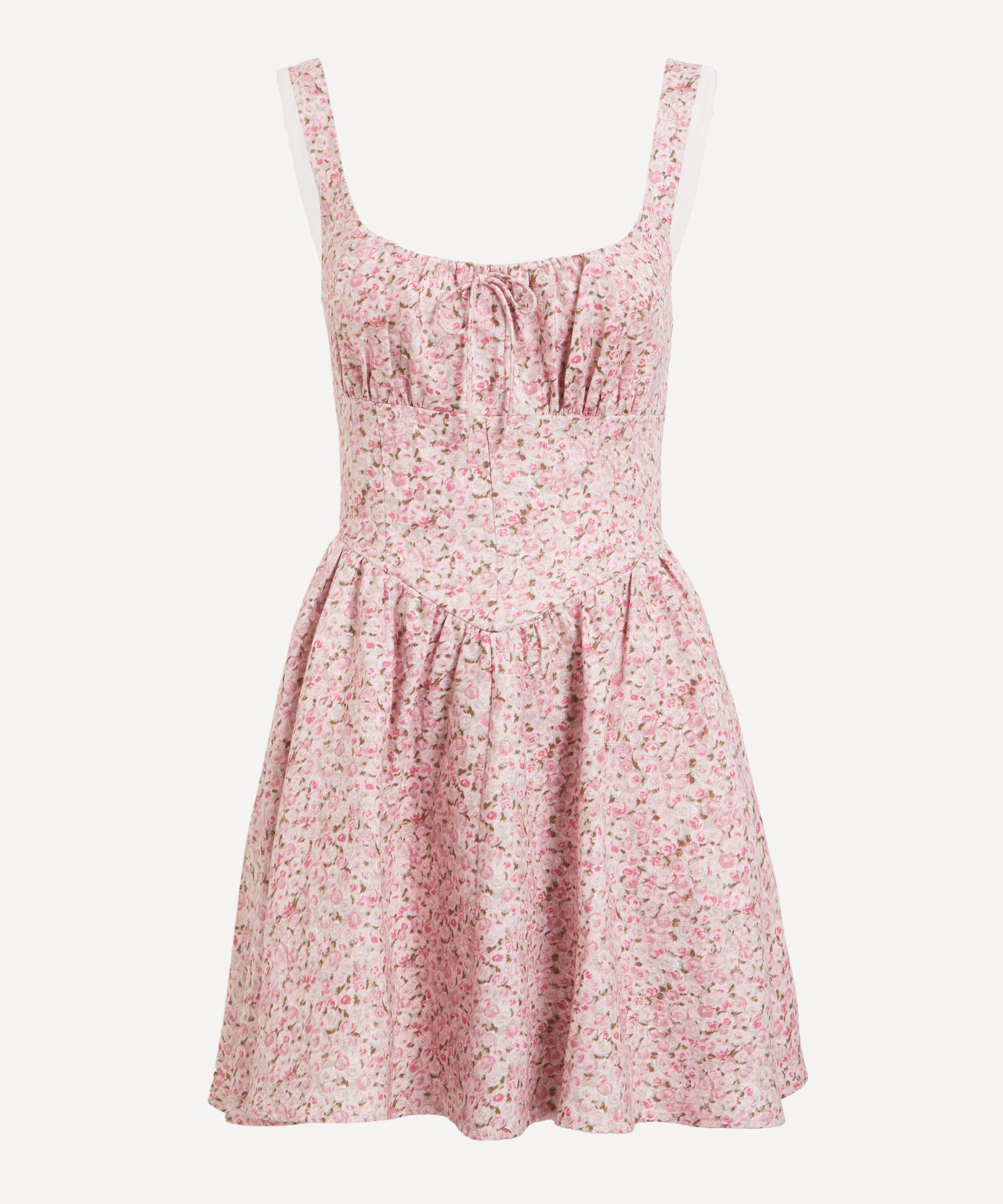 DETAILS Linen mini dress Fitted bodice Scoop neckline Gathered bust Back smocking A-line mini skirt Rosin print SIZE & FIT Model is 180cm/5'11"; Chest: 81cm; Waist: 61cm; Hip: 88cm and wears a size 8 COMPOSITION & CARE 100% Linen Wash cold, dry flat