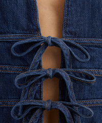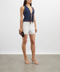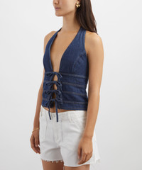 DETAILS Denim top Fitted throughout Halter neckline Deep V-neckline Four front ties SIZE & FIT Model is 175cm/5'9"; Chest: 81cm; Waist: 63.5cm; Hip: 92.5cm and wears a size 8 COMPOSITION & CARE 88% Cotton; 12% Spandex Wash cold. Line dry