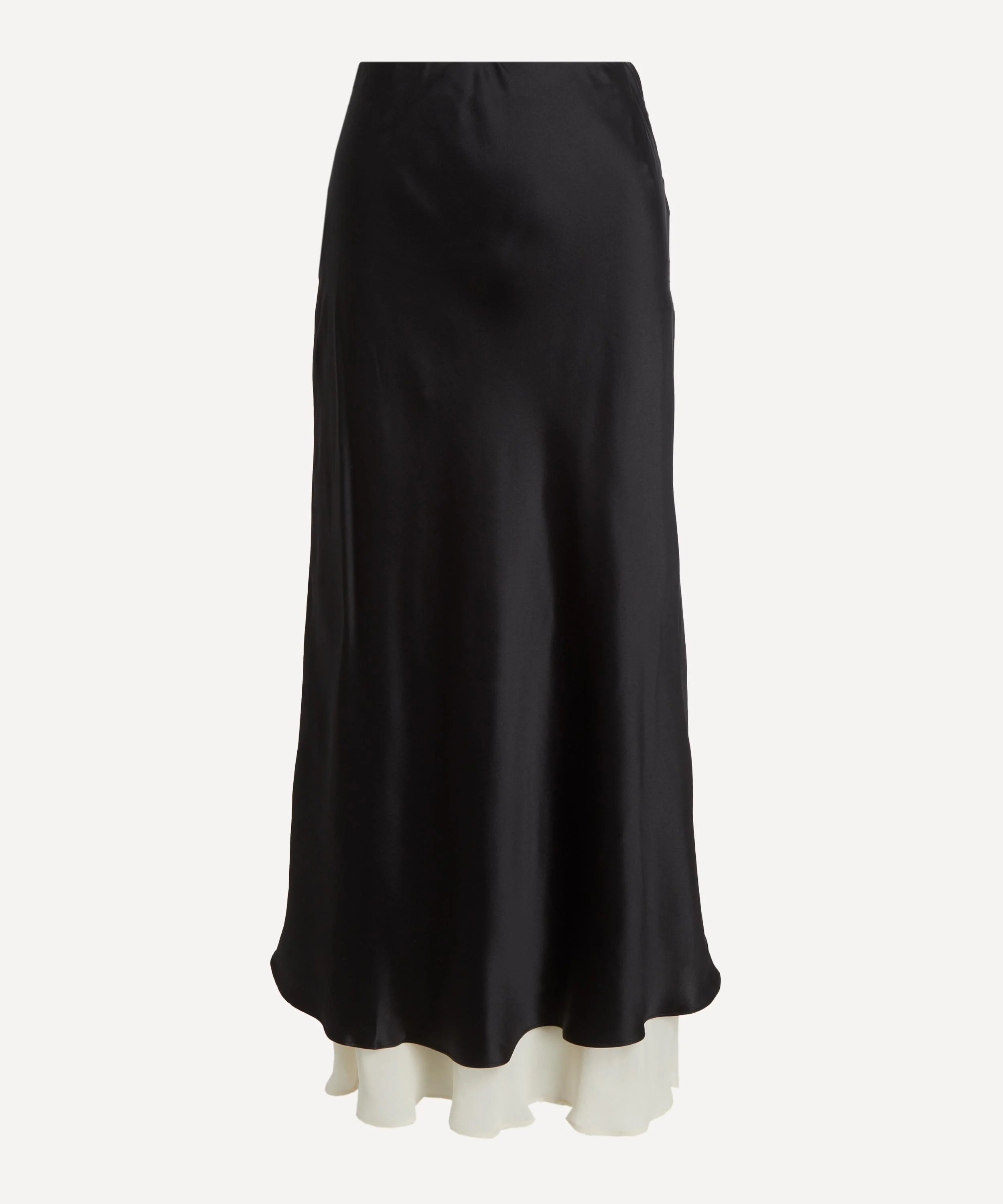 DETAILS Silk charmeuse skirt Midi length Relaxed drape Elasticated waistband Contrasting layered hem SIZE & FIT Model is 175cm/5'9"; Chest: 81cm; Waist: 63.5cm; Hip: 92.5cm and wears a size 8 COMPOSITION & CARE 100% Silk Dry clean