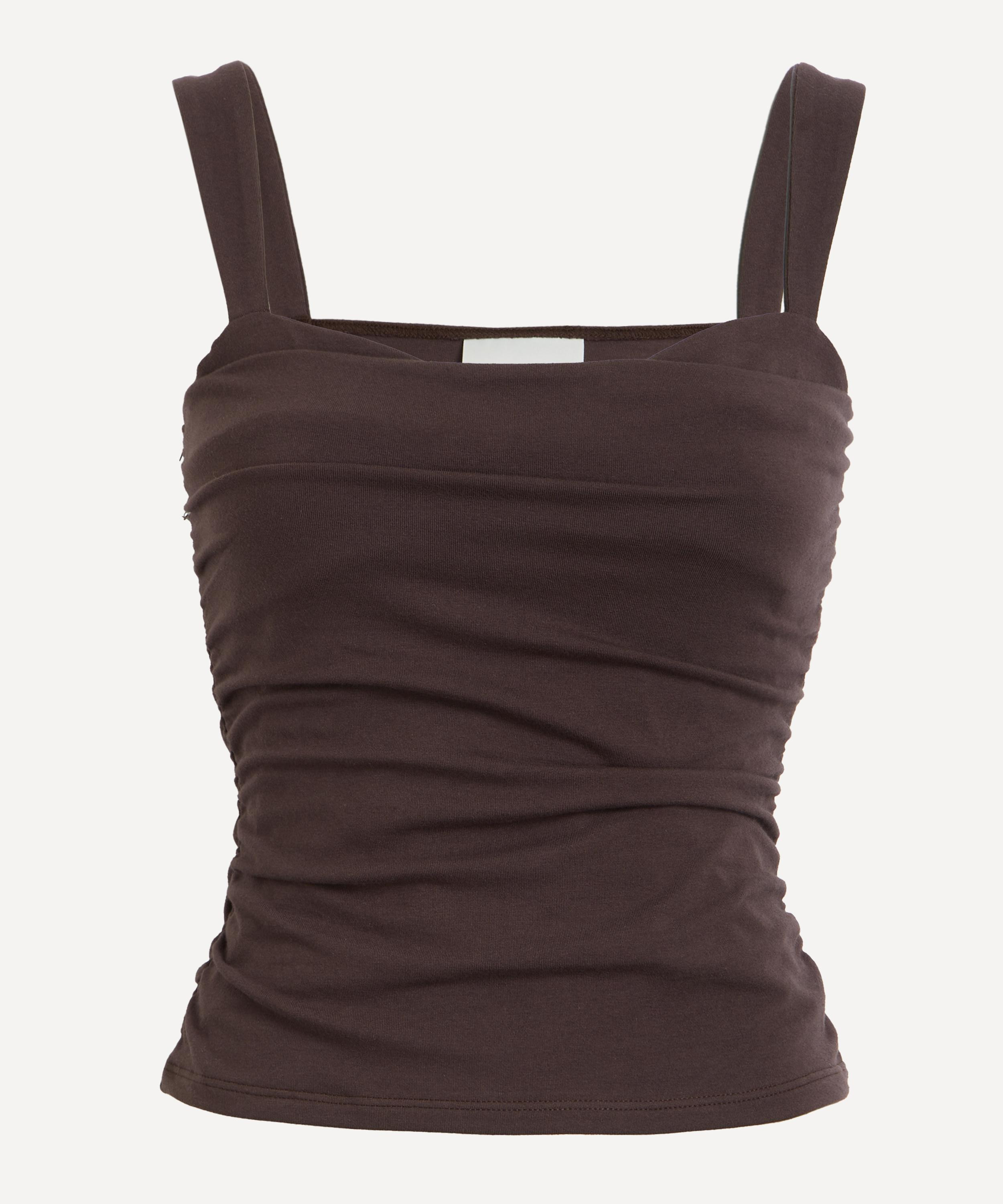 DETAILS Stretch jersey top Close fit Ruched detailing SIZE & FIT Model is 175cm/5'9"; Chest: 81cm; Waist: 63.5cm; Hip: 92.5cm and wears a size S COMPOSITION & CARE 88% Cotton; 12% Spandex Wash cold. Dry flat