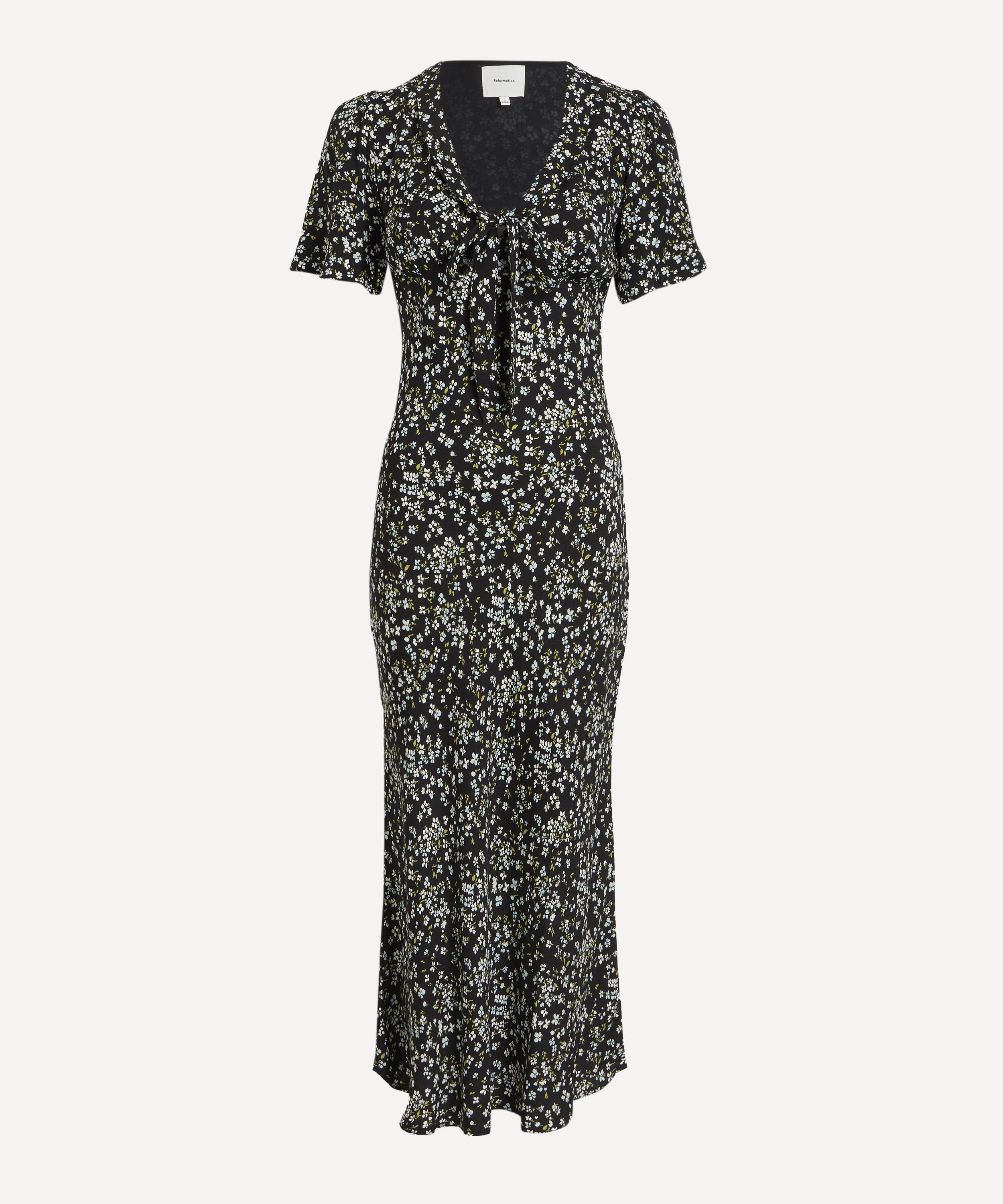 DETAILS Crepe midi dress Black ditsy floral print V-neckline Pussy-bow ties Empire waist Flowy skirt SIZE & FIT Model is 175cm/5'9"; Chest: 81cm; Waist: 63.5cm; Hip: 92.5cm and wears a size 8 COMPOSITION & CARE 53% Viscose; 47% TENCEL™ Lyocell Dry clean