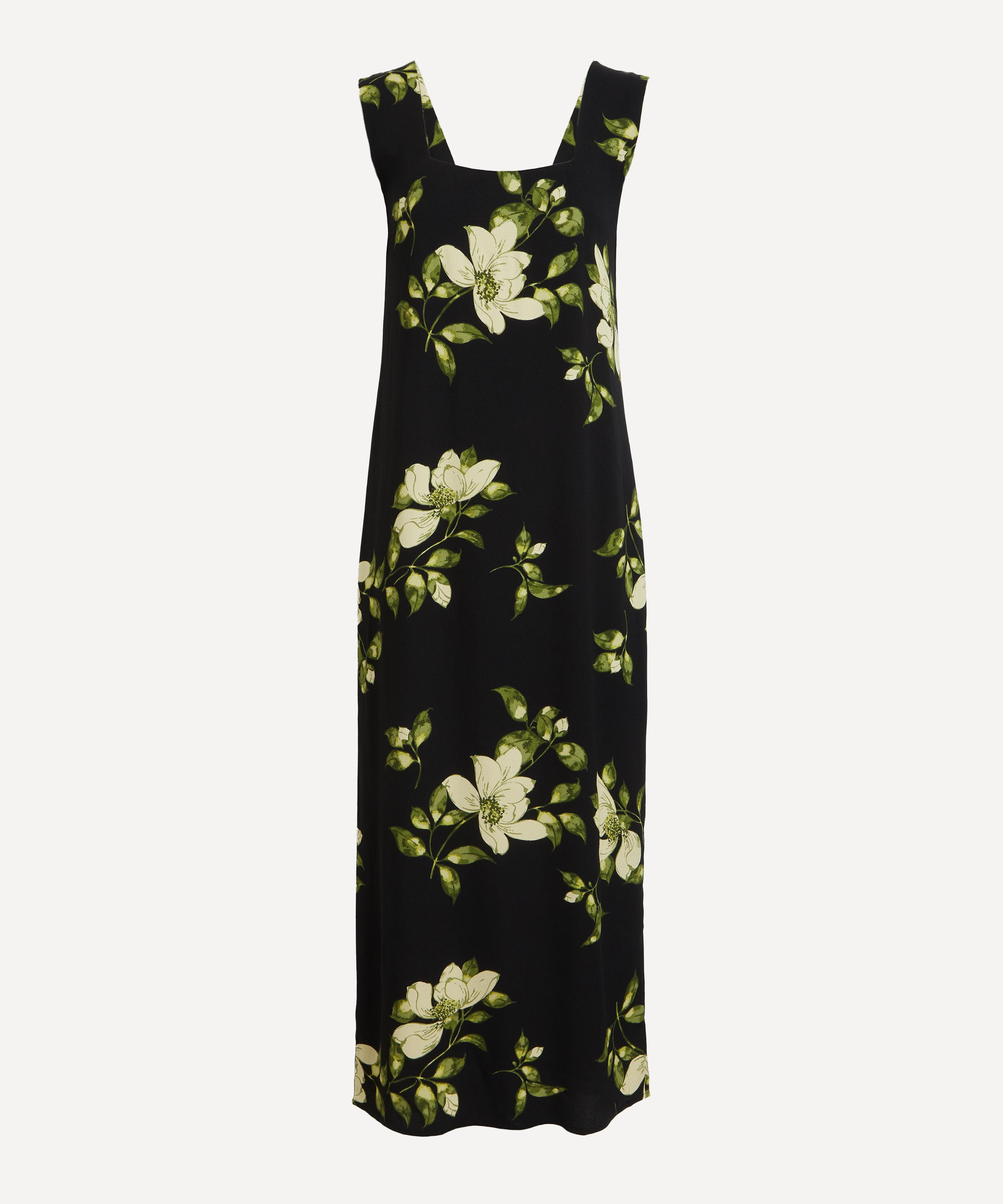 DETAILS Crepe midi dress Black floral print Relaxed fit Square neckline Adjustable straps Rear vent SIZE & FIT Model is 175cm/5'9"; Chest: 81cm; Waist: 63.5cm; Hip: 92.5cm and wears a size 8 COMPOSITION & CARE 53% Viscose; 47% LENZING™ ECOVERO™ Viscose Dry clean