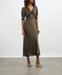 DETAILS Satin dress Fits true to size Ankle-length Short puff sleeves Shirred cuffs V-neckline Empire waist Bias-cut Lace trims Concealed side zip SIZE & FIT Model is 178cm/5'10"; Chest: 77cm; Waist: 65cm; Hip: 92cm and wears a size 8 COMPOSITION & CARE 100% Viscose Contrast: 100% Polyester Dry clean