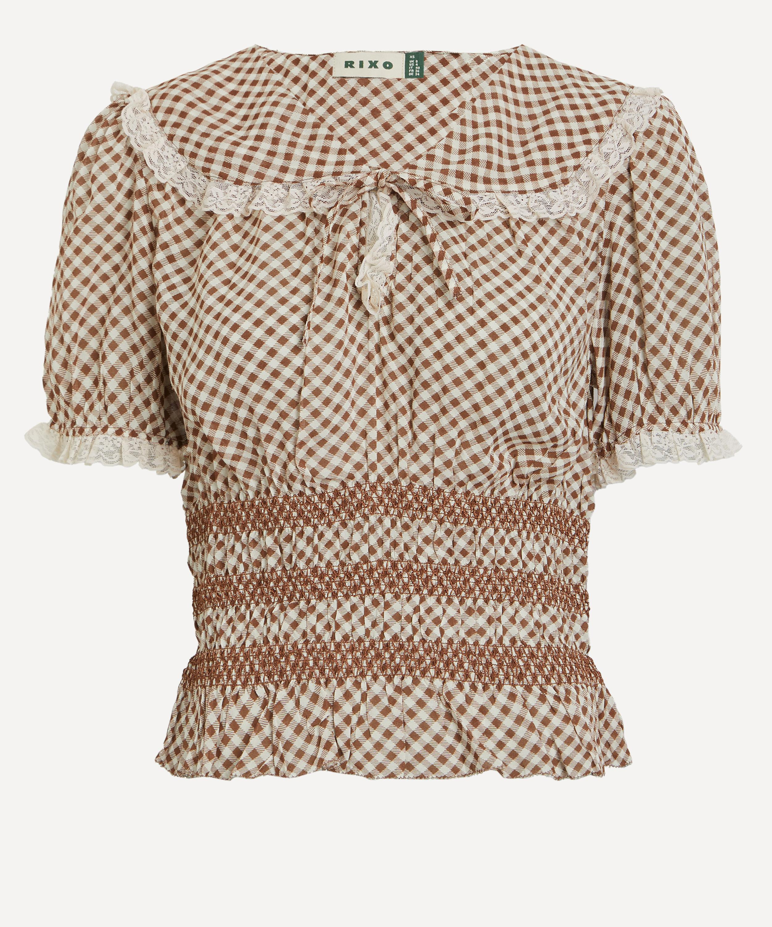 DETAILS Crepe top V-neckline Oversized Peter Pan collar with ties Short puff sleeves Smocked bodice Lace trims SIZE & FIT Model is 178cm/5'10"; Chest: 79cm; Waist: 62cm; Hip: 88cm and wears 8 COMPOSITION & CARE 60% Rayon; 40% Viscose Dry clean