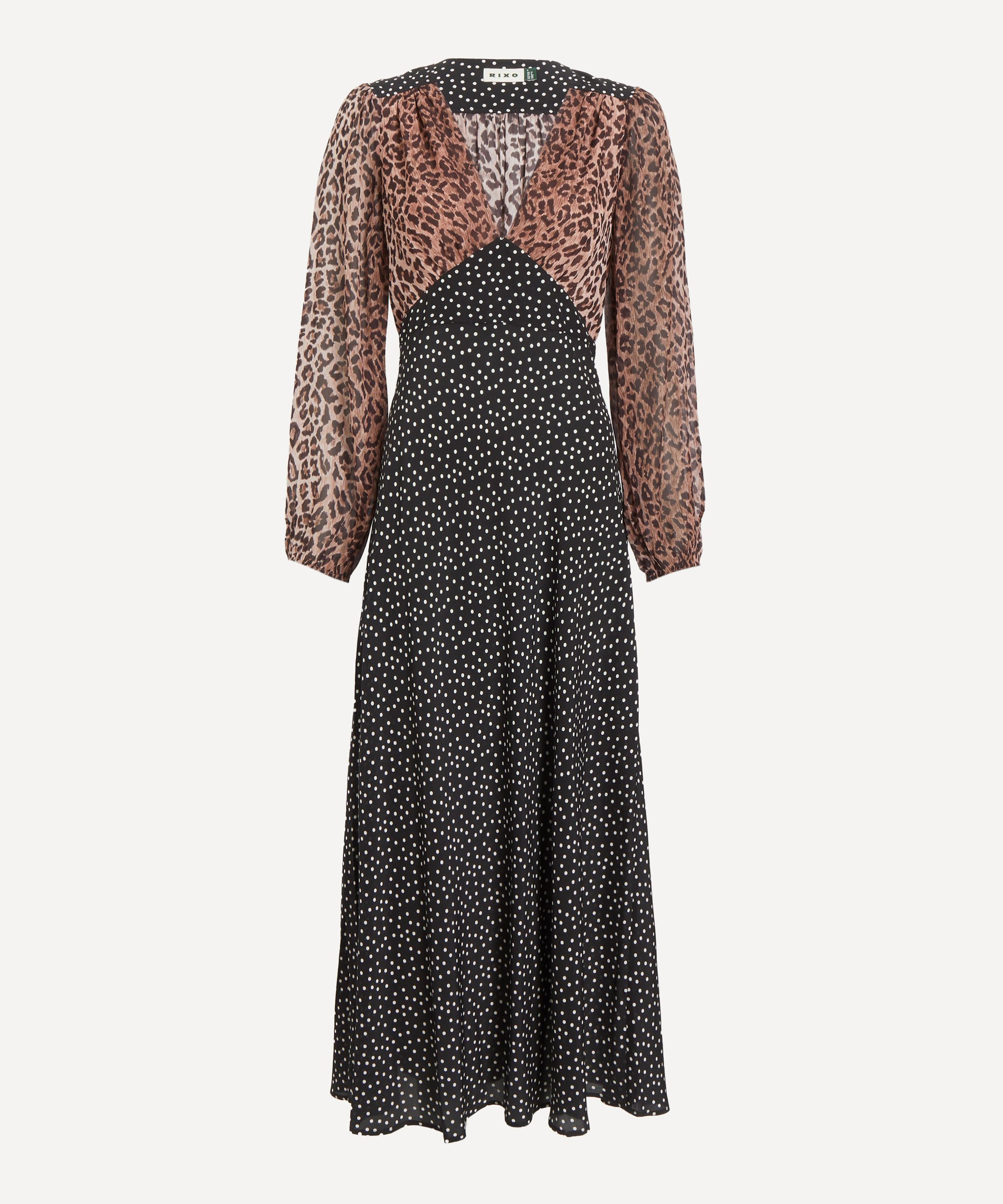 DETAILS Silk crepe de chine dress Fits true to size Midi length Long blouson sleeves Elasticated cuffs V-neckline Empire waist Adjustable back ties Concealed zip fastening at side Contrasting leopard and polka-dot prints SIZE & FIT Model is 175cm/5'9"; Chest: 76cm; Waist: 58cm; Hip: 90cm and wears a size S COMPOSITION & CARE 100% Silk Dry clean