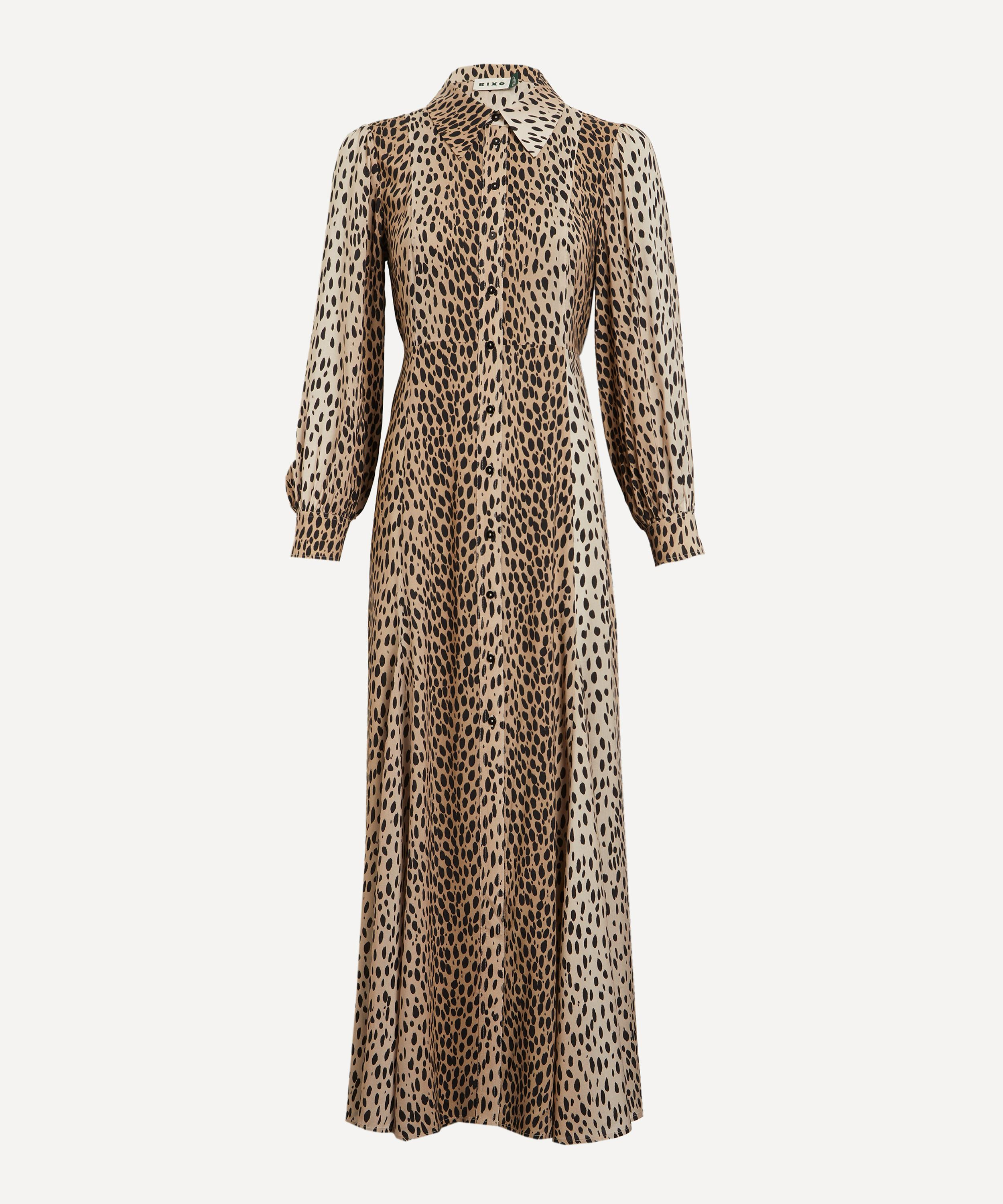 DETAILS Maddison Shirt-Dress Viscose crepe All-over leopard print Ankle length Straight fit A-line skirt Adjustable waist ties Pointed collar Full neck to hem buttoned placket Long puffed sleeves Gathered cuffs Antelope Spot Black print SIZE & FIT Model is 176cm/5'7"; Chest: 76.5cm; Waist: 61.5cm; Hip: 88cm and wears a size S COMPOSITION & CARE 100% Viscose Dry clean only