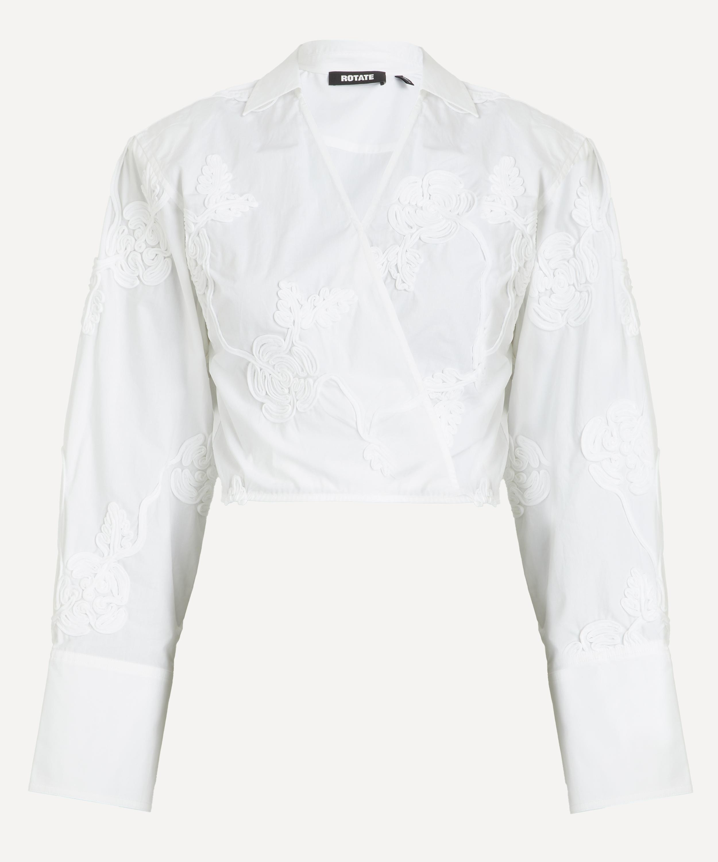 DETAILS Cotton shirt Cropped fit Wrap-over design Long sleeves Collared V-neckline Adjustable ties Tonal floral embroidery SIZE & FIT Model is 175cm/5'9"; Chest: 76cm; Waist: 58cm; Hip: 90cm and wears a size 38 COMPOSITION & CARE 100% Cotton Composition 2: 100% Polyester Dry clean