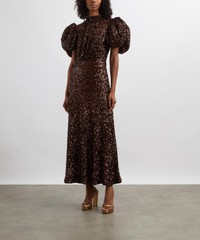 DETAILS Sequin dress Fit-and-flare silhouette Midi length Short puff sleeves High neckline with back ties Fitted waist Flowing A-line skirt Lined SIZE & FIT Model is 178cm/5'10"; Chest: 77cm; Waist: 65cm; Hip: 92cm and wears a size 8 COMPOSITION & CARE 95% Polyester; 5% Elastane Lining: 95% Polyester; 5% Elastane Dry clean