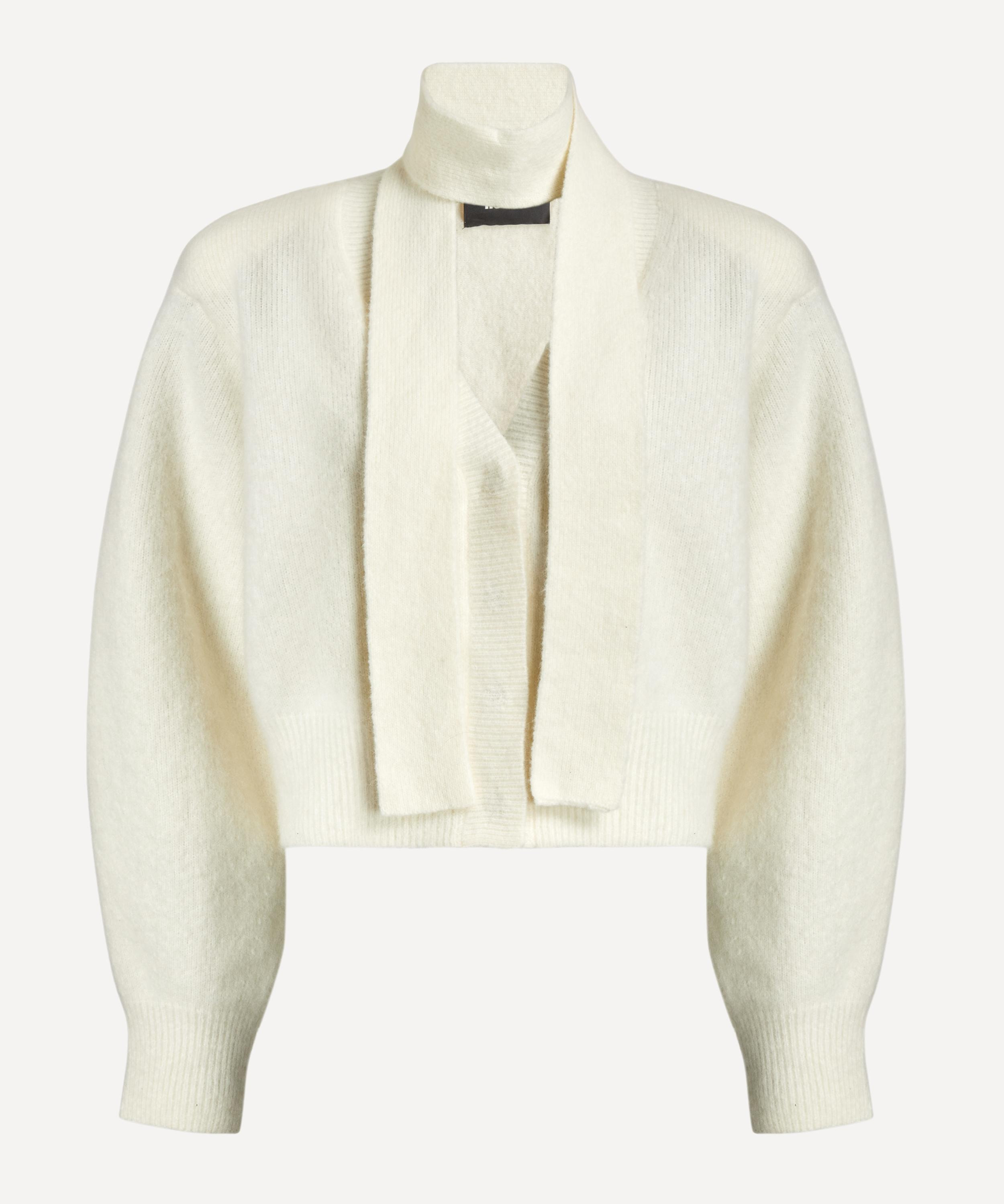 DETAILS Knit cardigan Wool blend Cropped length V-neckline Scarf detail attached to the collar Long sleeves Concealed closure Ribbed hem, cuffs, and neckline SIZE & FIT Model is 176cm/5'9.5"; Chest: 81cm; Waist: 62.5cm; Hip: 89cm and wears a size S COMPOSITION & CARE 32% Wool; 32 % Alpaca; 30% Polyamide; 6% Elastane Dry clean