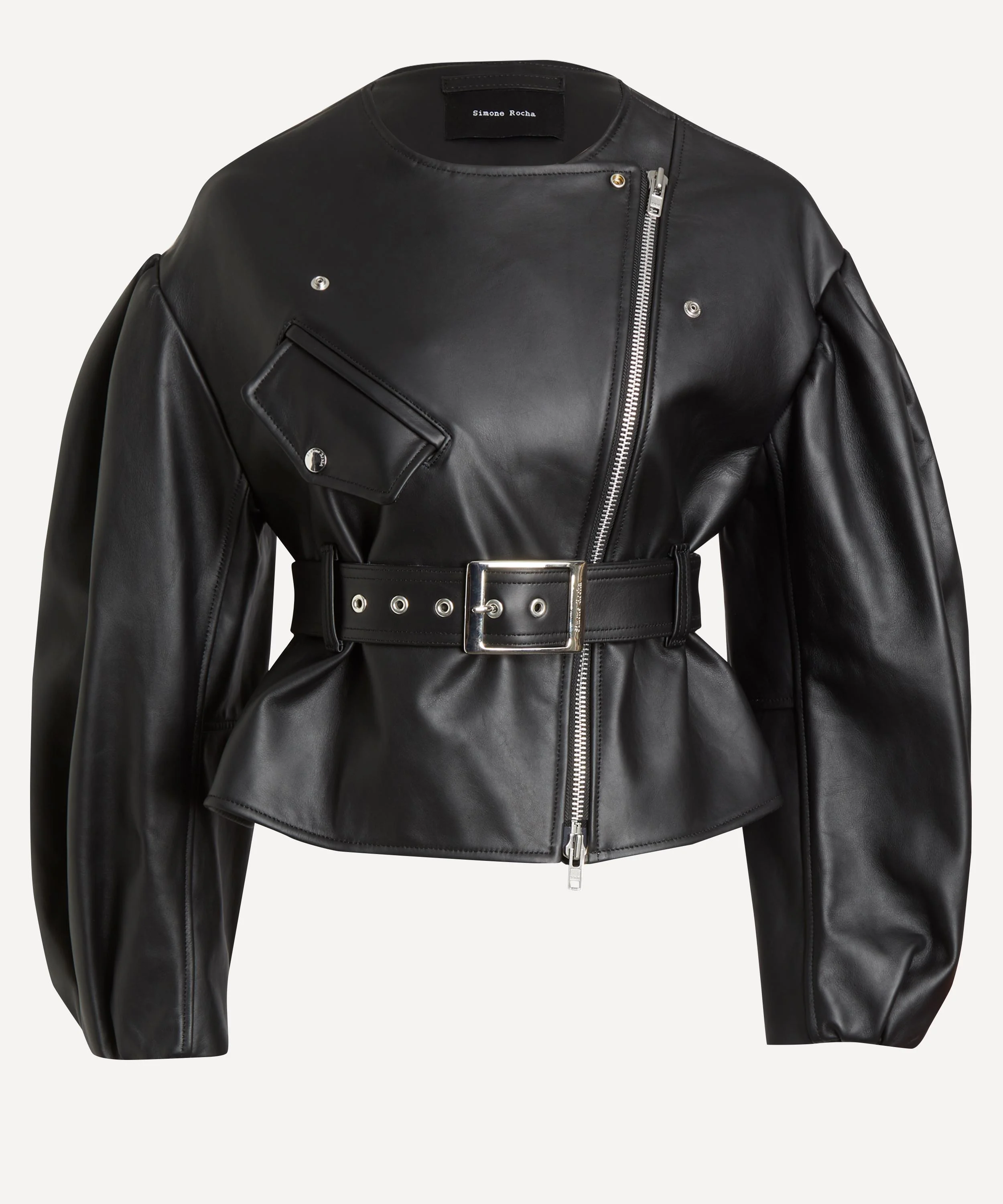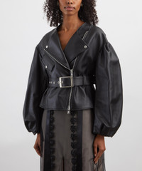 DETAILS Leather biker jacket Slim fit Sculpted silhouette Cropped length Rounded shoulders Long puff sleeves Collarless Zip fastening Adjustable buckle belt Flap and zip pockets Peplum hem Lined SIZE & FIT Model is 178cm/5'10"; Chest: 77cm; Waist: 65cm; Hip: 92cm and wears a size 8 COMPOSITION & CARE 100% Leather Specialist dry clean