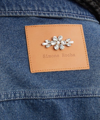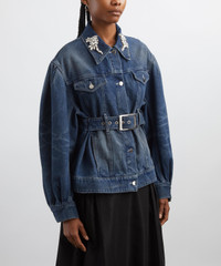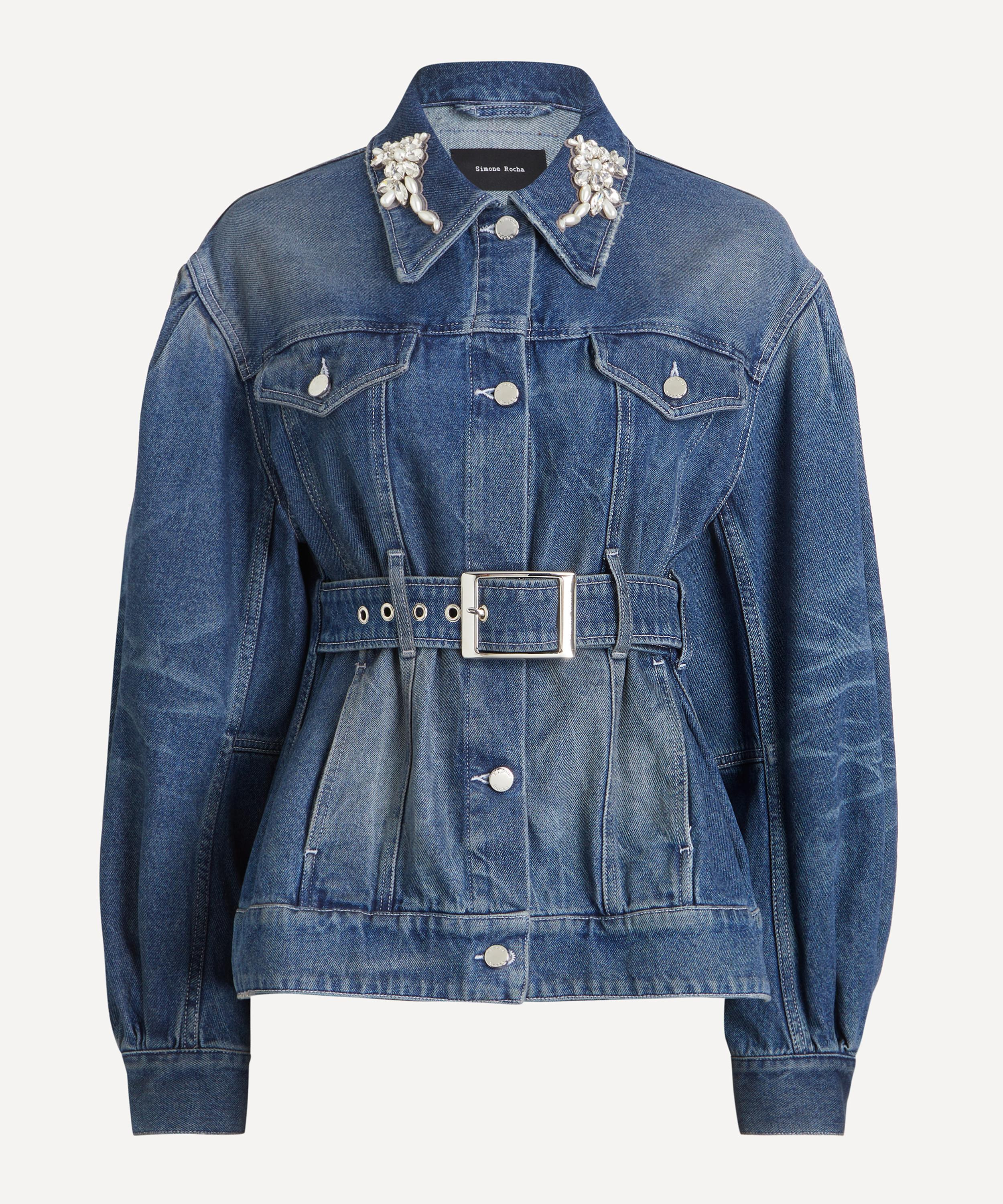 DETAILS Distressed cotton denim biker jacket Sculpted silhouette Fits true to size Rounded shoulders Long sleeves with buttoned cuffs Front button fastening Adjustable buckle belt Chest flap pockets Floral pearl and crystal embellishments Branded jacron patch on back SIZE & FIT Model is 180cm/5'11"; Chest: 81cm; Waist: 61cm; Hip: 88cm and wears a size 8 COMPOSITION & CARE 100% Cotton Dry clean