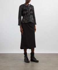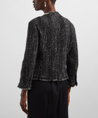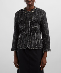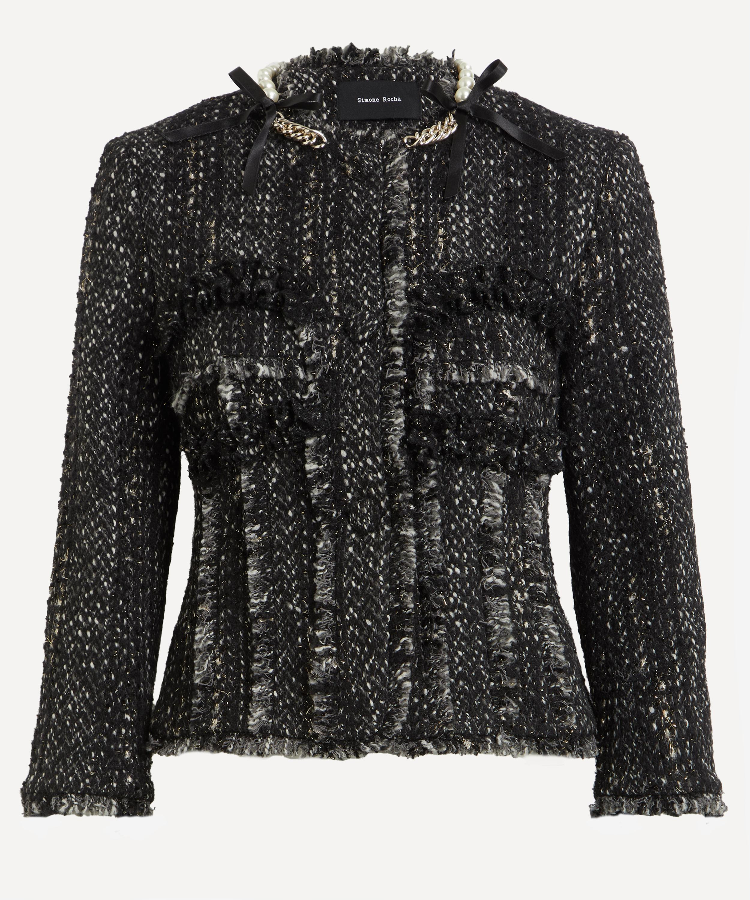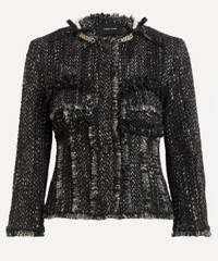 DETAILS Tweed jacket Slim fit Cinched silhouette Oversized, sculptural silhouette Cropped sleeves Button closure Frayed edging throughout Pearl and chain embellishment Lined SIZE & FIT Model is 178cm/5'10"; Chest: 79cm; Waist: 62cm; Hip: 88cm and wears 8 COMPOSITION & CARE 42% Polyester; 23% Polycarbonate; 17% Virgin wool; 10% Cotton; 7% Nylon; 1% Viscose Lining: 100% Viscose Dry clean