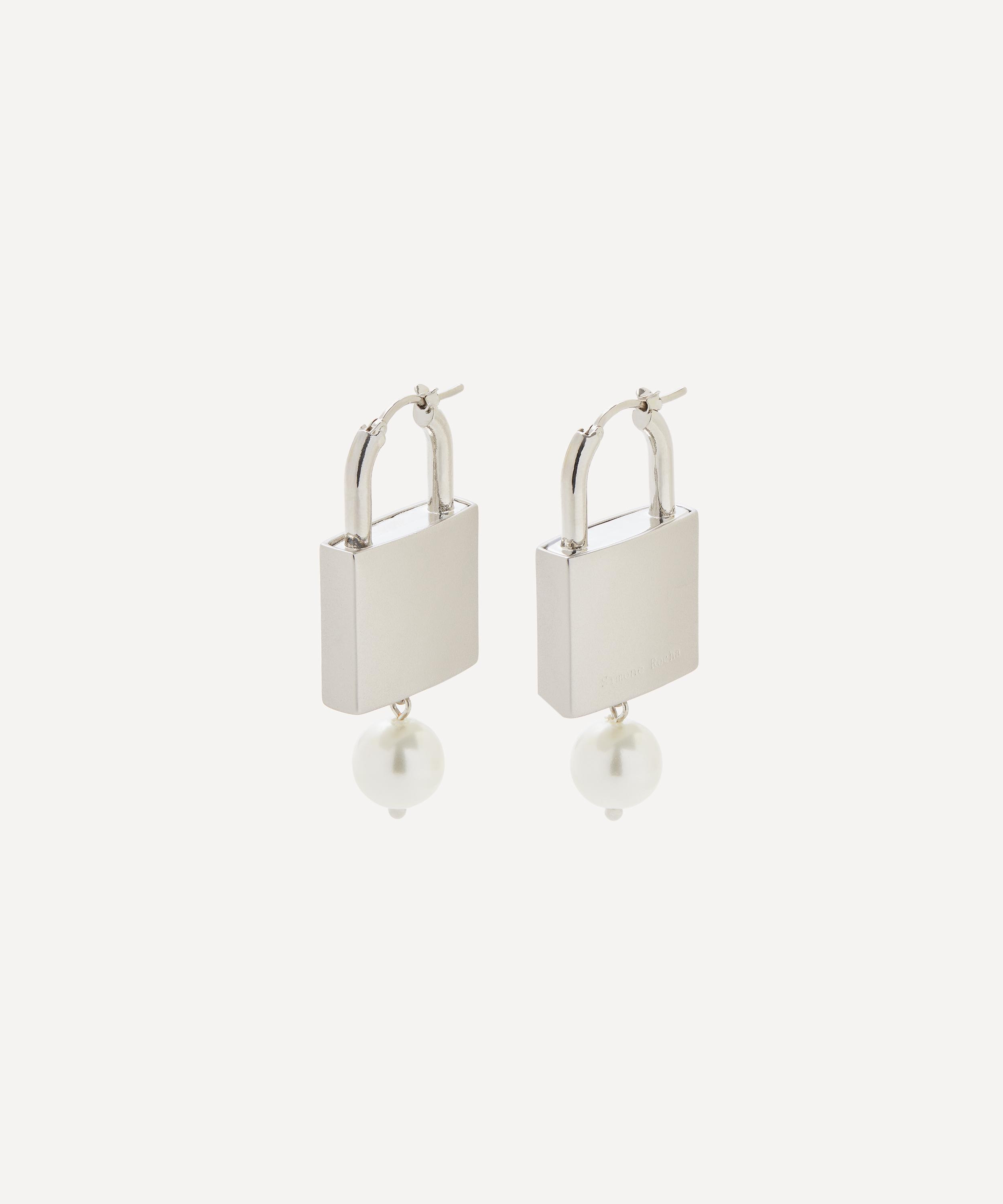 DETAILS Drop earrings Padlock shape Engraved logo Faux pearl embellishment Hinge clasp fastening COMPOSITION & SIZE 90% Brass; 10% Faux Pearl (Resin)