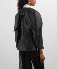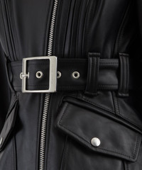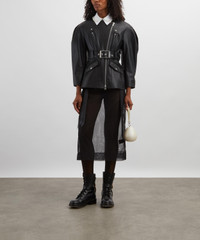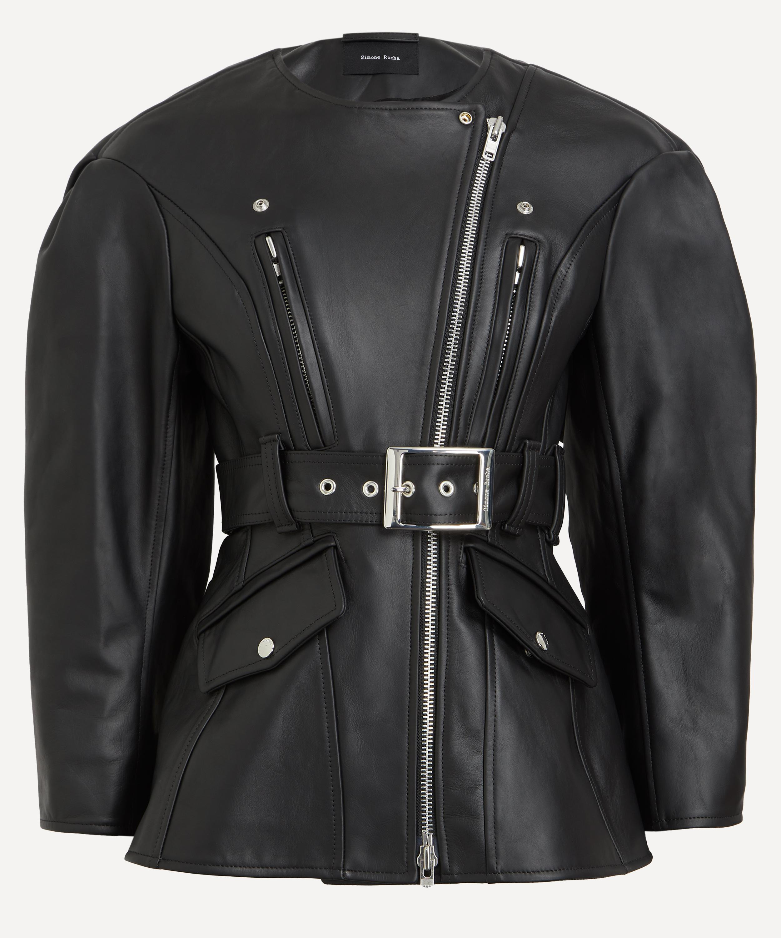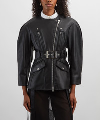 DETAILS Leather biker jacket Sculpted silhouette Fits true to size Rounded shoulders Long sleeves with zipped cuffs Round neckline Front zip fastening Adjustable buckle belt Two zip pockets Two flap pockets Bow embellishment at back Lined SIZE & FIT Model is 178cm/5'10"; Chest: 77cm; Waist: 65cm; Hip: 92cm and wears a size 8 COMPOSITION & CARE 100% Leather Specialist dry clean