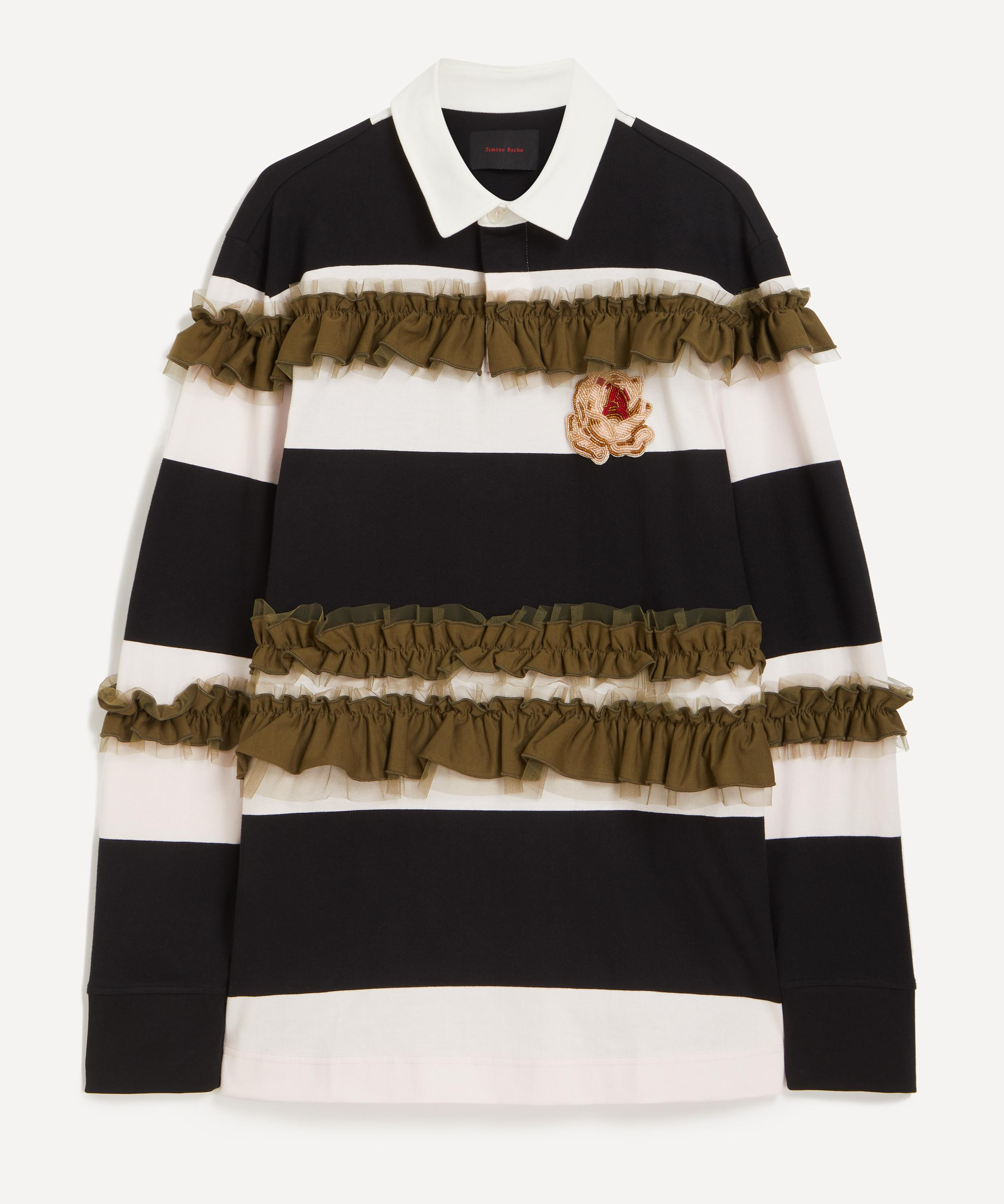 DETAILS Striped cotton rugby shirt Oversized fit Dropped shoulders Contrasting collar Partial button placket Ruffle detail throughout Beaded rose embellishment at chest SIZE & FIT Model is 188cm/6'2"; Chest: 92cm; Waist: 80cm and wears a size M COMPOSITION & CARE Main: 100% Cotton Ruffle trim: 100% Nylon Dry clean
