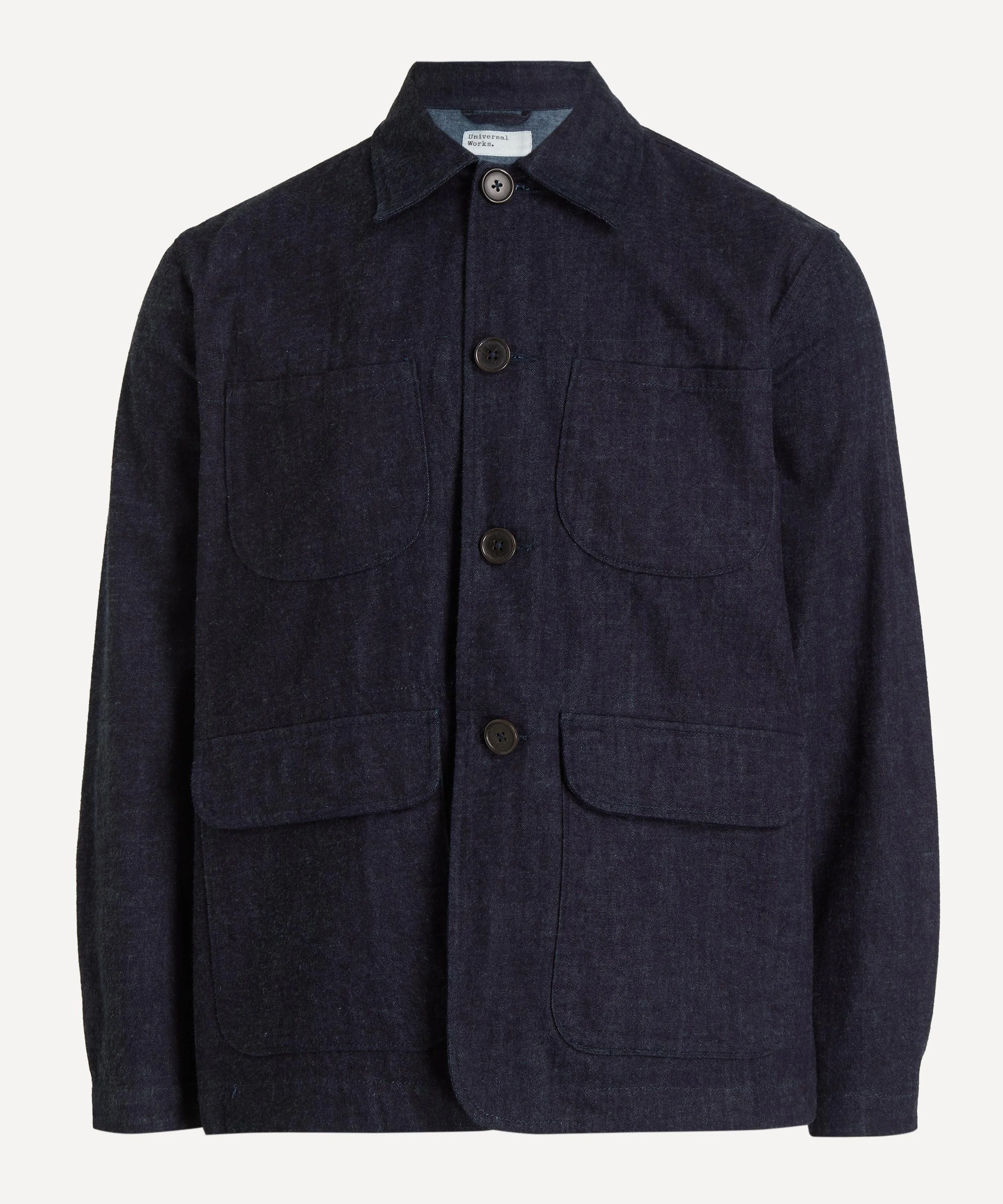 DETAILS Labour jacket Work denim Wide, loose fit Classic collar Button fastening Waist ties Chest patch pockets Two lower flap patch pockets SIZE & FIT Model is 188cm/6'2"; Chest: 91cm; Waist: 79cm and wears a size M COMPOSITION & CARE 100% Cotton Delicate wash at 30°C degrees. Do not bleach. Do not tumble dry. Cool iron. Do not dry clean