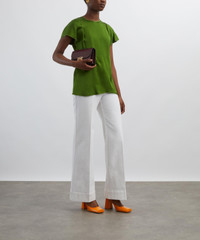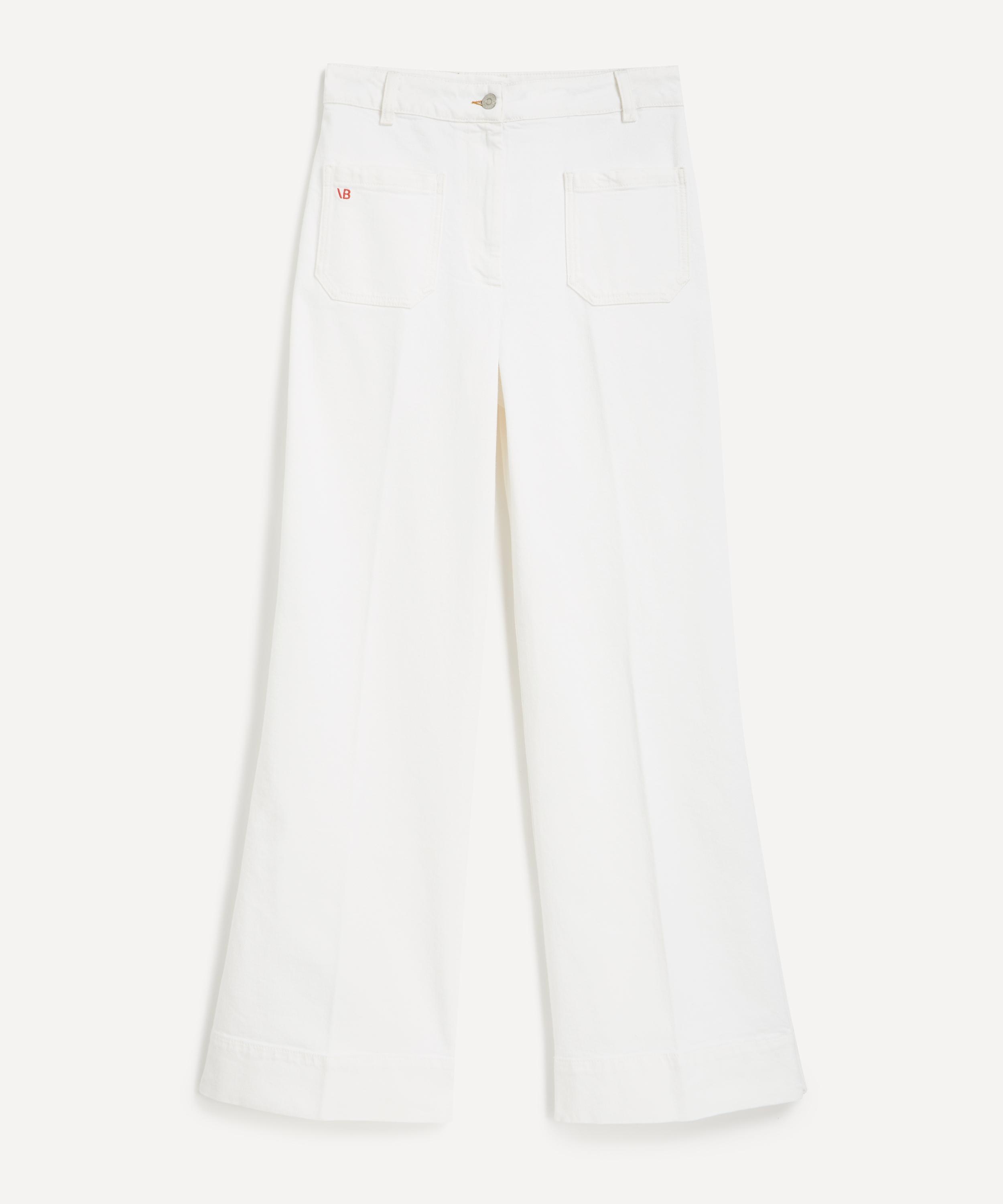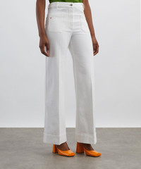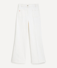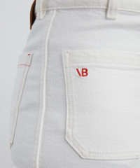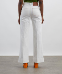 DETAILS Alina jeans Cotton denim High waisted Flared leg Centre-front crease Front and back patch pockets with tobacco topstitching Antique copper branded denim shank button Red embroidered monogram Designer wash: Washed White Made in Italy SIZE & FIT Model is 175cm/5'9"; Chest 30cm; Waist: 61cm; Hip: 89.5cm and wears a size 27 COMPOSITION & CARE 100% Cotton Machine wash 30°C