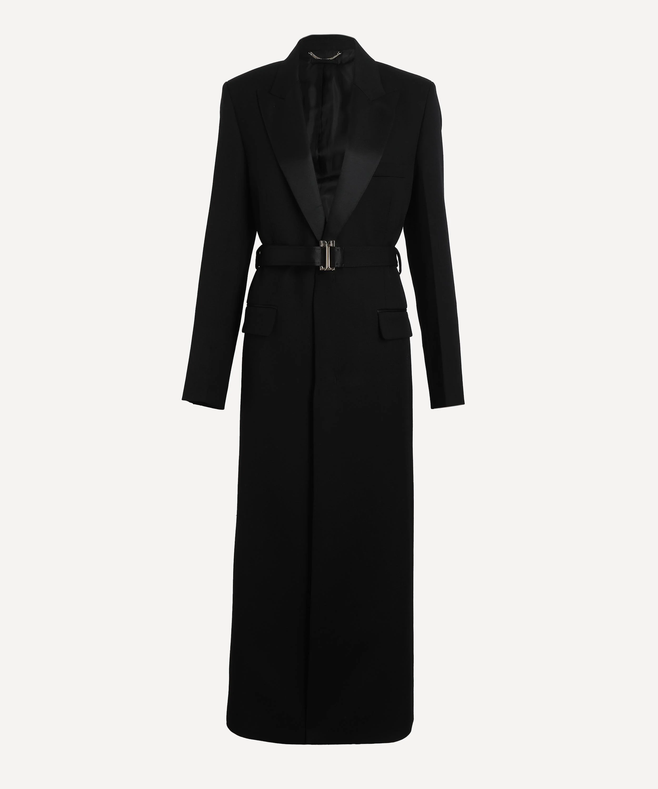 DETAILS Grain de poudre coat Fits true to size Longline Contrast satin lapels, belt, and belt loop Hidden button closure B-trim belt Front and chest welt pockets Centre-back vent SIZE & FIT Model is 180cm/5'11"; Chest: 79cm; Waist: 62cm; Hip: 89cm and wears a size 8 COMPOSITION & CARE 55% Polyester; 45% Virgin wool Dry clean